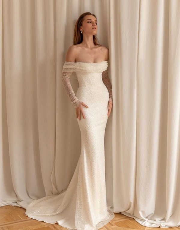 Mẫu váy cưới đẹp thiết kế tay dài, dáng chữ A sẽ giúp cân đối vóc dáng quả lê
