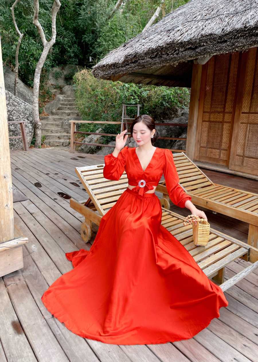 Đầm Mặc Đi Biển Khoét Eo Tay Dài Đỏ DM123 dành cho cô gái cung Bạch Dương