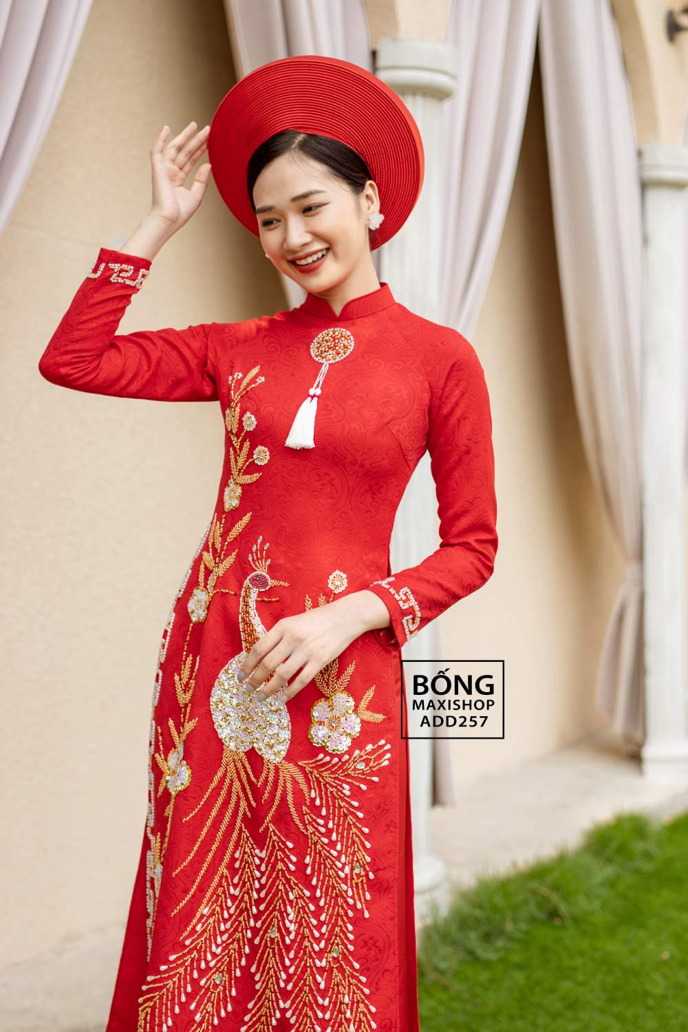 Áo dài cô dâu gấm đỏ hoàng gia kết phụng ADD257 sở hữu những đường may tinh tế cùng chất liệu vải gấm cao cấp, mềm mại đã tạo nên một chiếc áo dài kín đáo. Chiếc áo dài sở hữu hình ảnh phượng hoàng được thiết kế kết cườm tỉ mỉ cùng các đường cong uyển chuyển tạo nên vẻ đẹp duyên dáng, thanh tao cho nàng. Ngoài ra, hình ảnh phượng hoàng còn là biểu tượng của hoàng gia và sự quyền quý vào thời xưa.