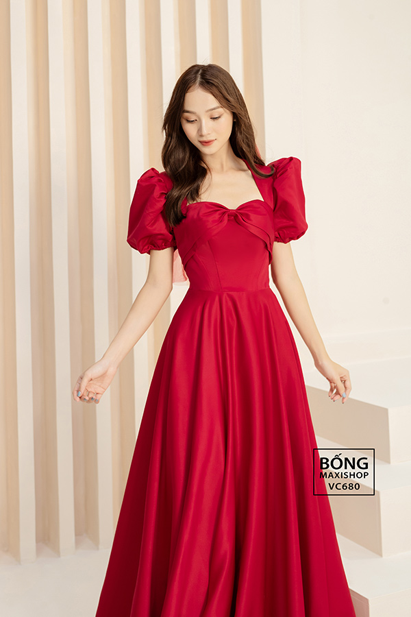Mua ngay: Váy cưới phi nhật nơ ngực tay phồng đỏ VC680D