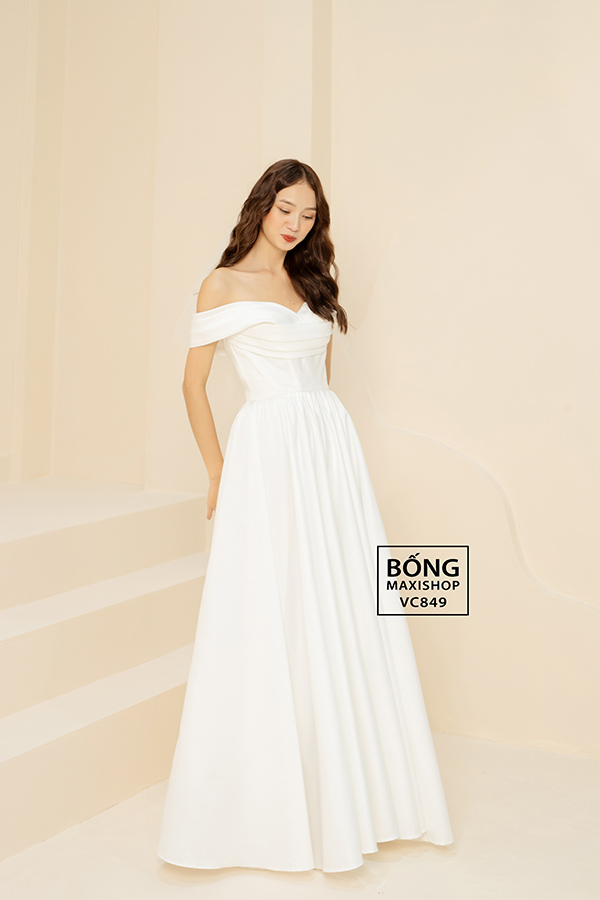 Xem thêm: Váy cưới phi nhật trễ vai xếp ly thân ngực trắng VC849
