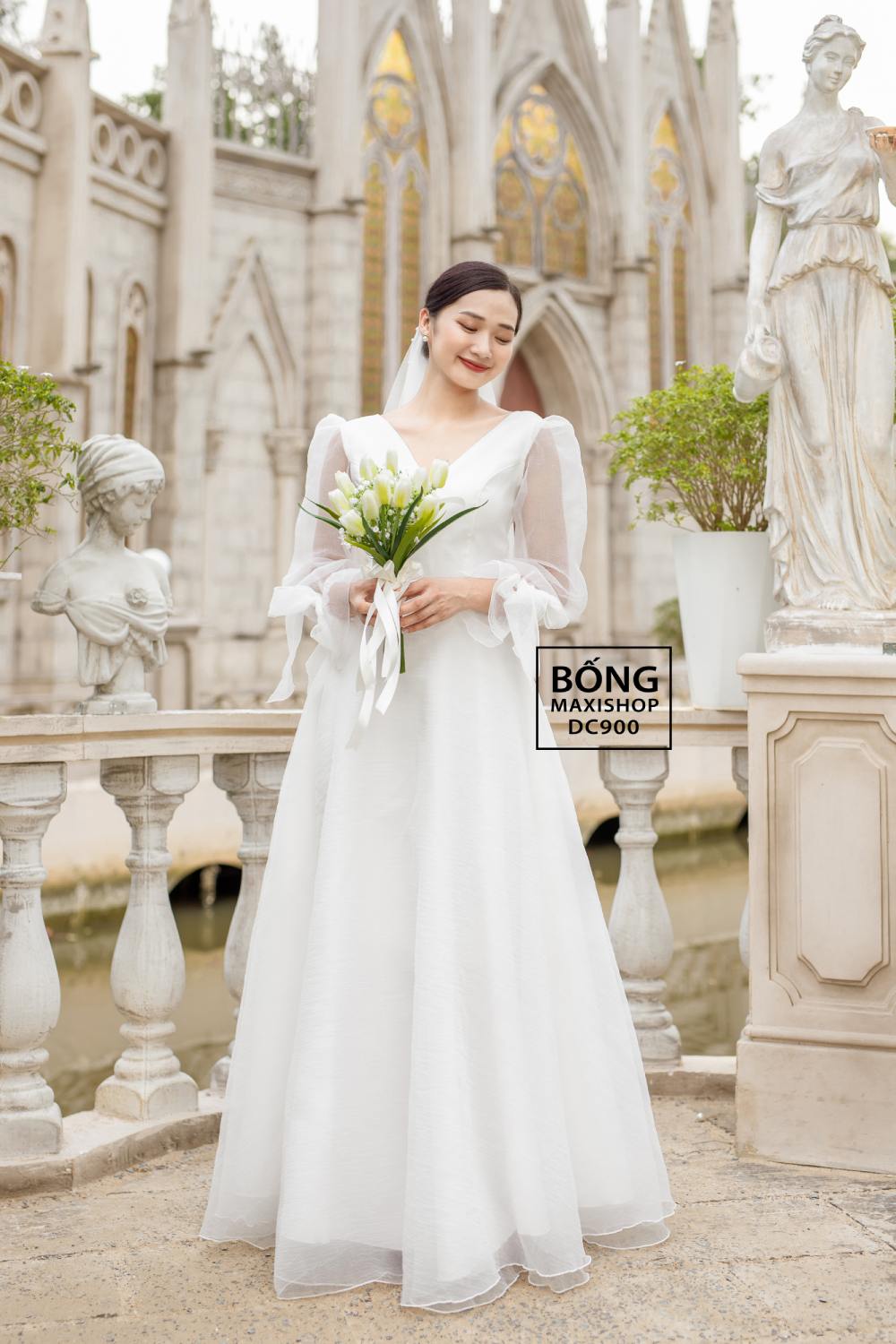 Váy cưới đơn giản tinh tế xốp trắng cổ V DC900