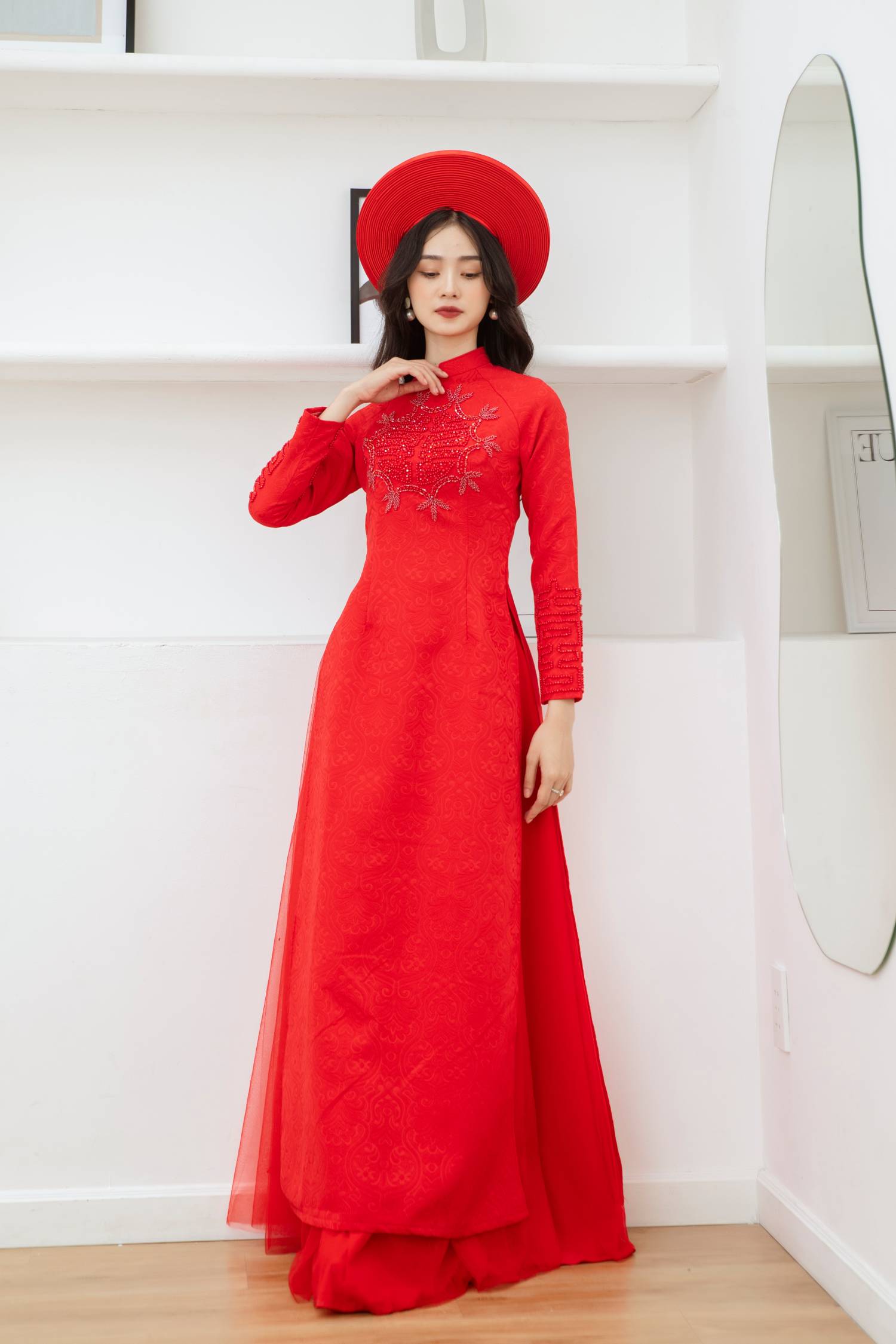 Áo dài cưới năm 2022 bằng gấm hoàng gia đỏ kết cườm ADD212