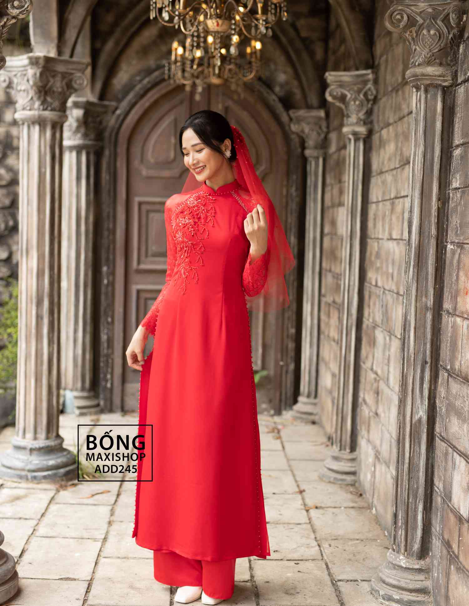 Mua ngay: Áo dài cô dâu lụa đỏ phối ren ADD245