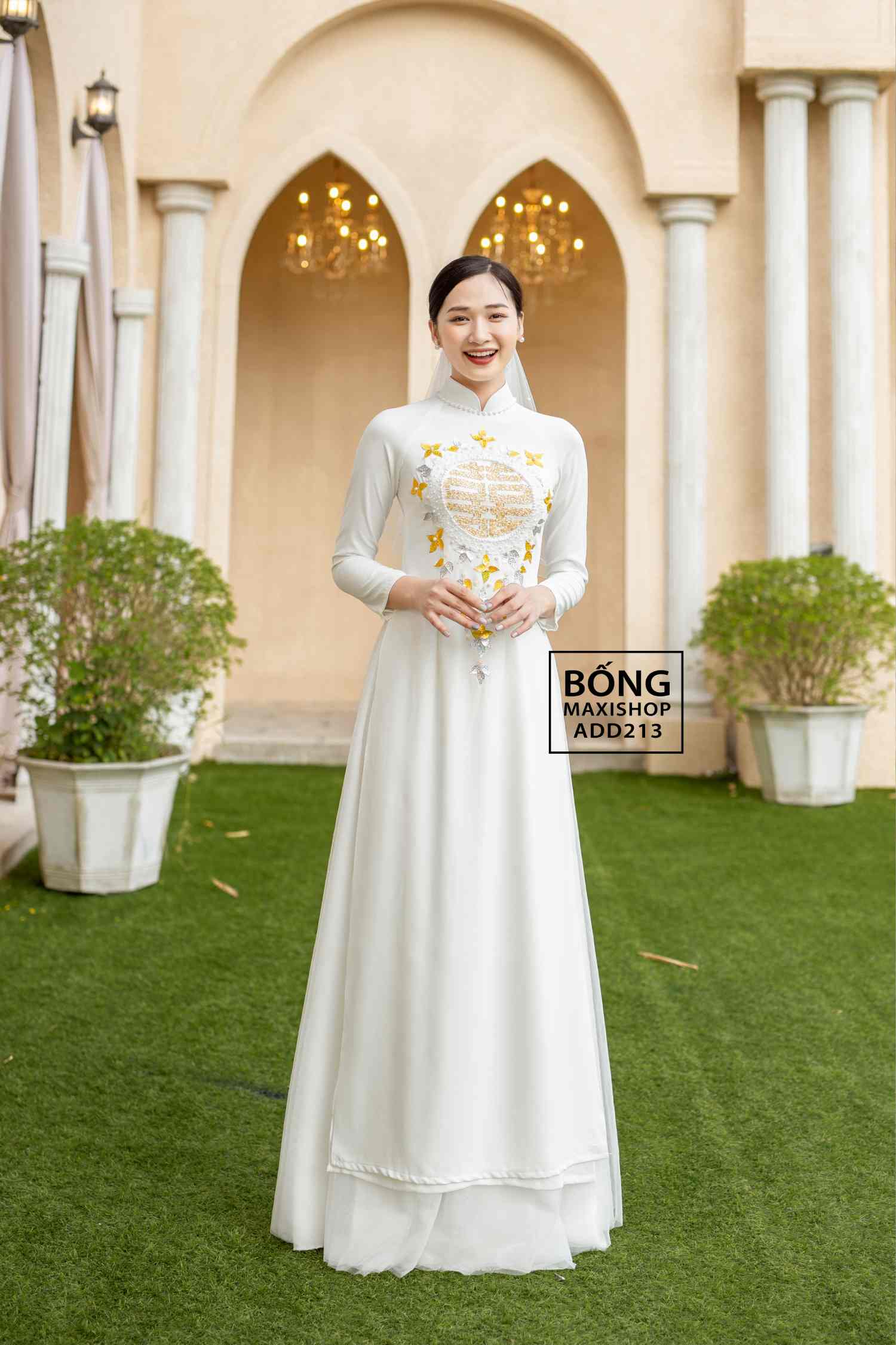 Áo dài cưới năm 2022 cho cô dâu từ lụa trắng phối voan kết cườm lá vàng ADD213