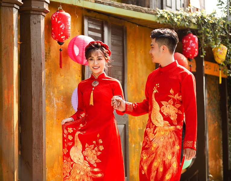 Áo dài cưới năm 2022 truyền thống màu đỏ họa tiết chim công