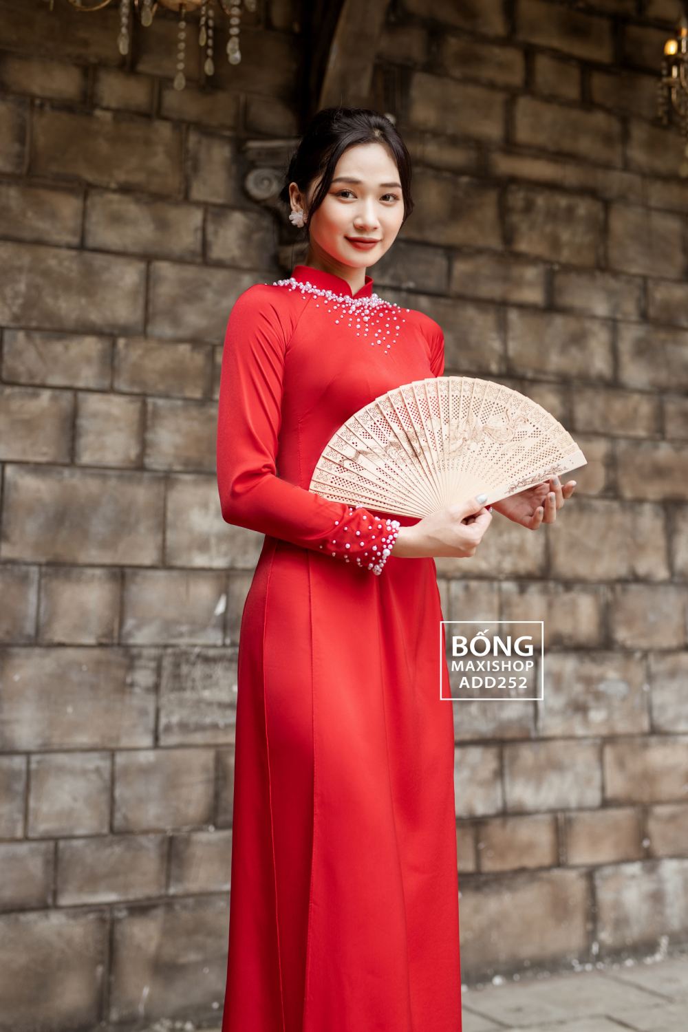 Mua ngay: Áo dài cô dâu gấm đỏ viền ngọc 4 tà nền hoa cúc ADD223