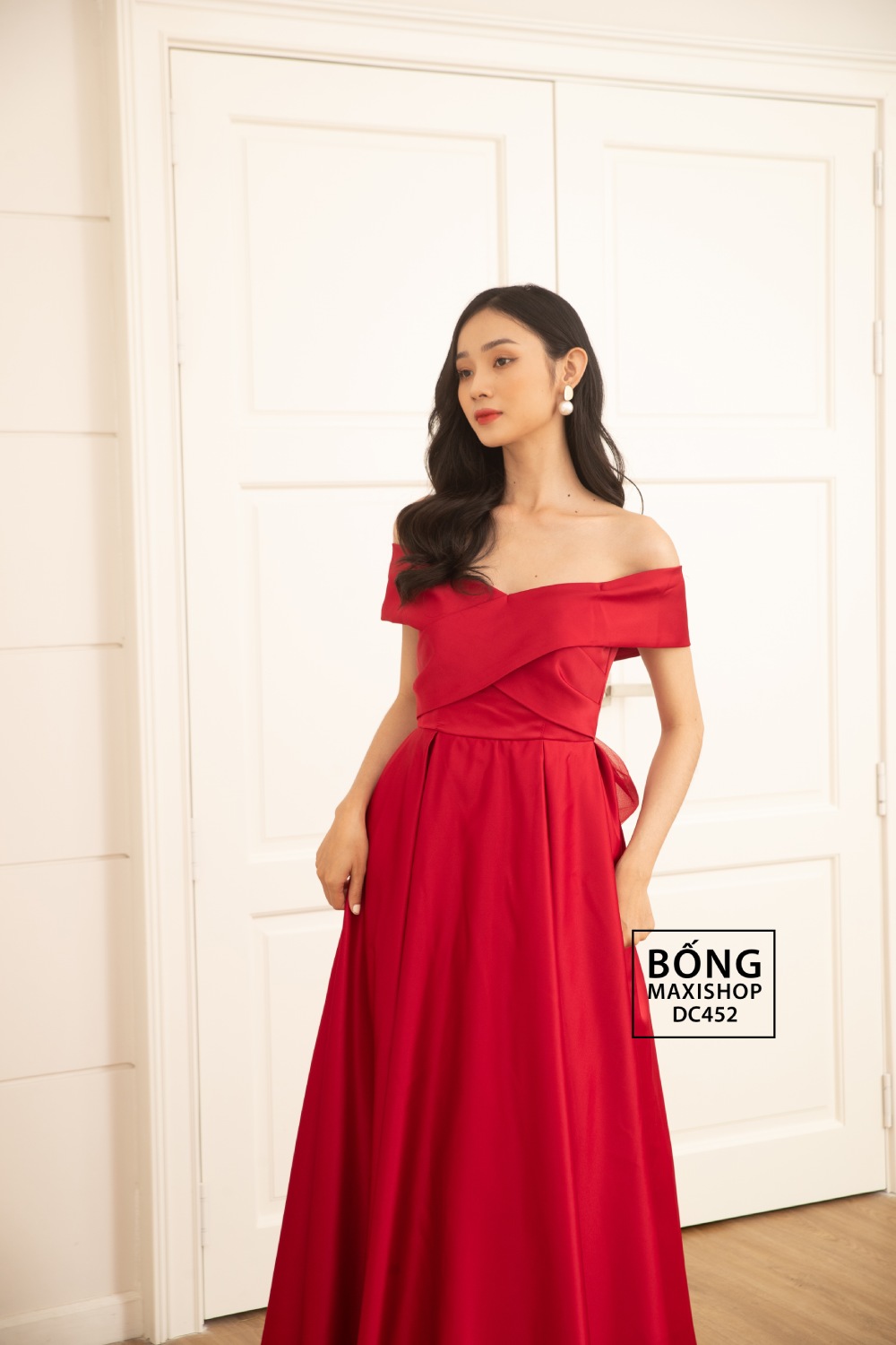 Mua ngay: Váy cưới phi nhật đỏ trễ vai chéo nơ xốp DC452D