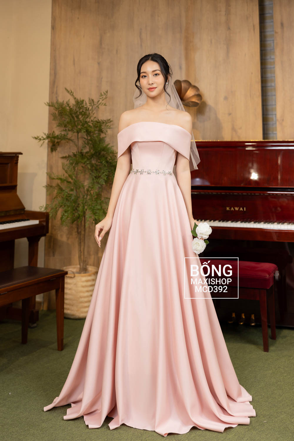 Váy cưới phi nhật trễ vai ngang hồng đai eo hoa đá MCD392H