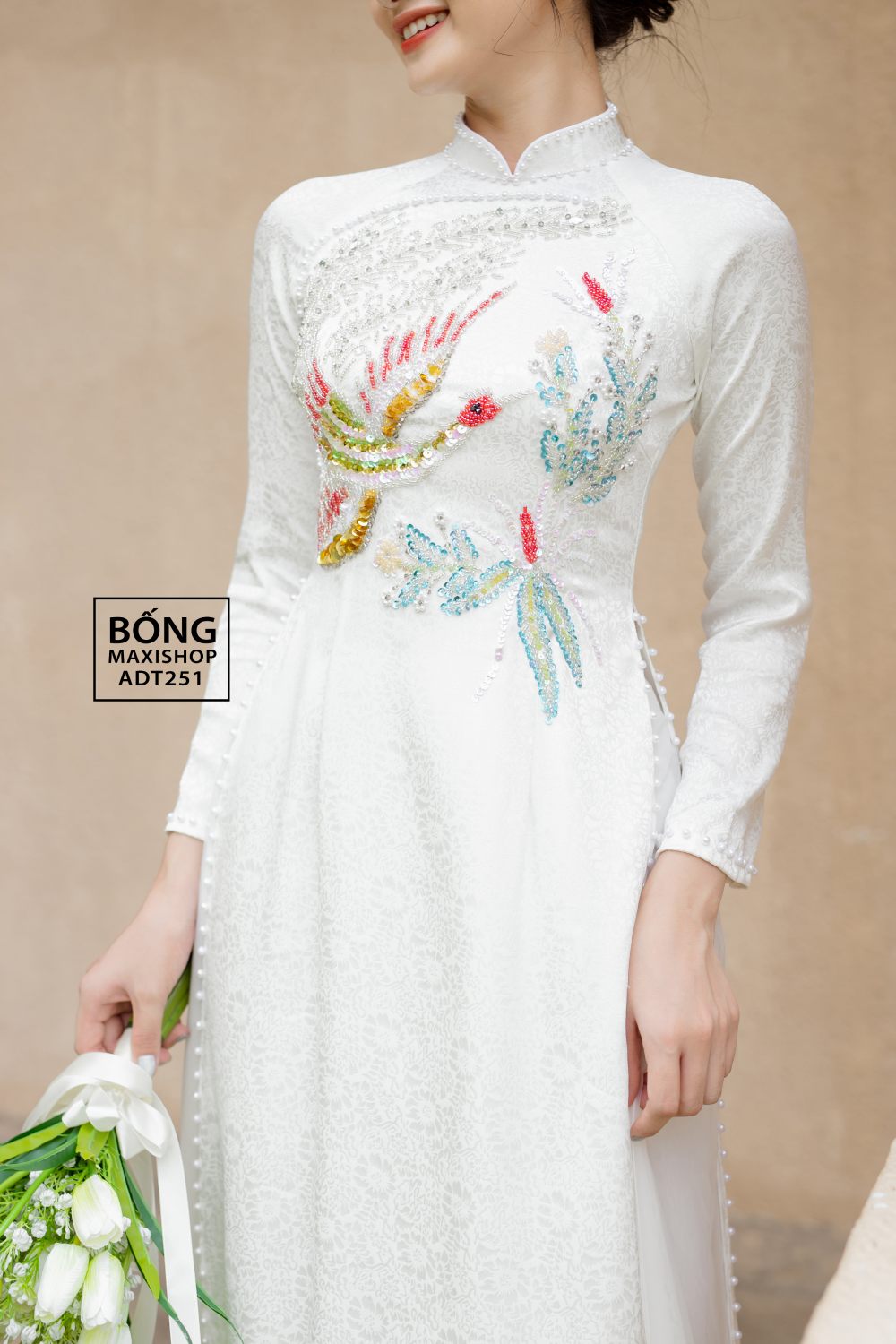 Áo dài cô dâu gấm trắng kết chim phượng cổ 2 viền ngọc ADT251 mang vẻ đẹp truyền thống quý tộc sẽ làm nhiều cô nàng phải ấn tượng. Chiếc áo dài được làm từ chất liệu vải gấm mềm mịn, bóng nhẹ và những đường may từ các tay thợ lành nghề đảm bảo sẽ đem lại sự bền bỉ, cảm giác thoải mái khi mặc và tôn lên vóc dáng một cách tinh tế. Họa tiết các đóa hoa trên vải gấm hòa quyện với sắc trắng tinh khôi, kết hợp với thiết kế đính ngọc ở viền áo mang lại nét trong trẻo, thuần khiết nhưng không kém phần sang trọng. Hình ảnh chim phương được kết cườm một cách tỉ mỉ không chỉ là điểm nhấn nổi bật mà còn mang lại ý nghĩa biểu tượng của hoàng gia và sự quyền quý vào thời xưa.