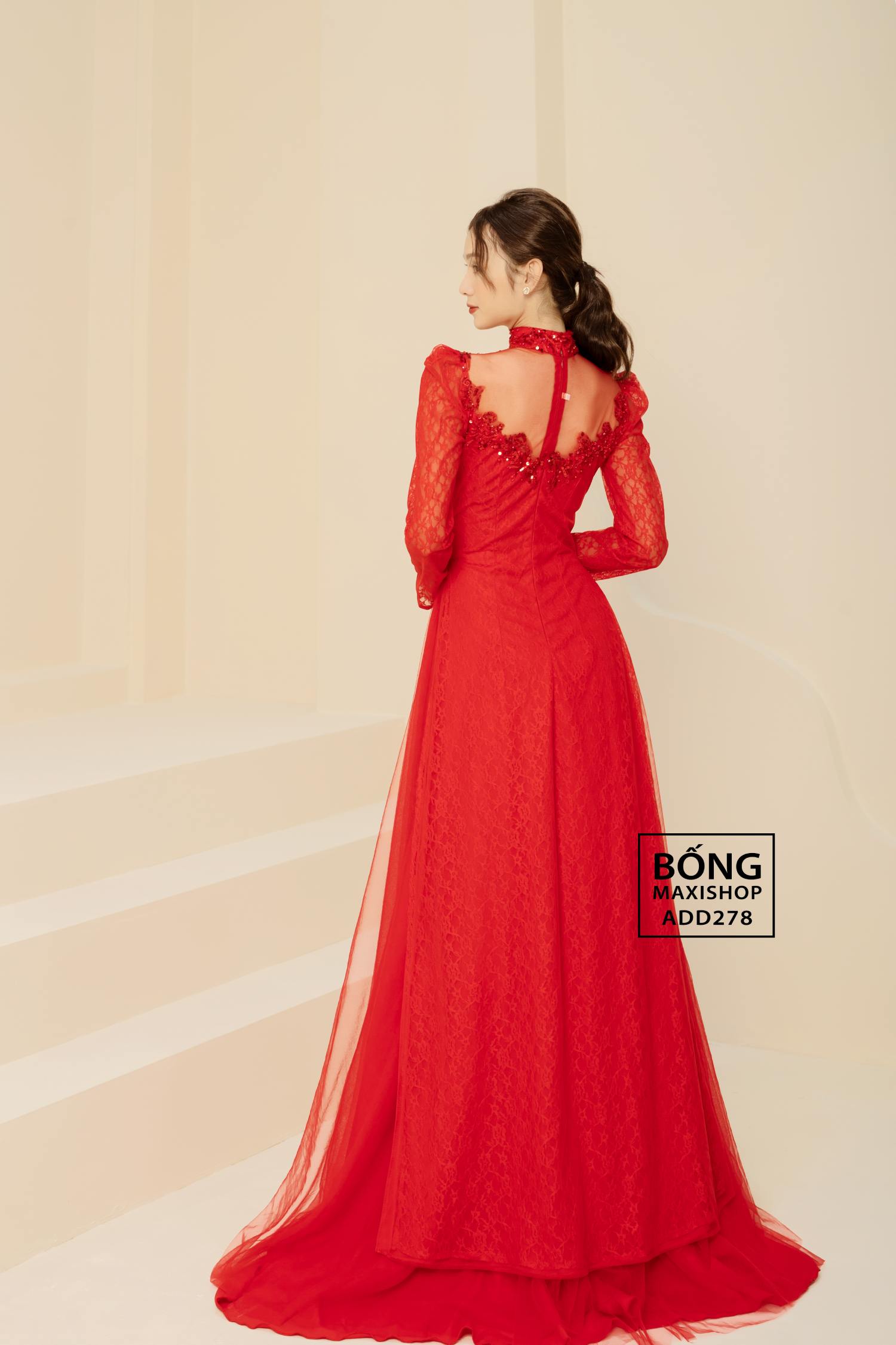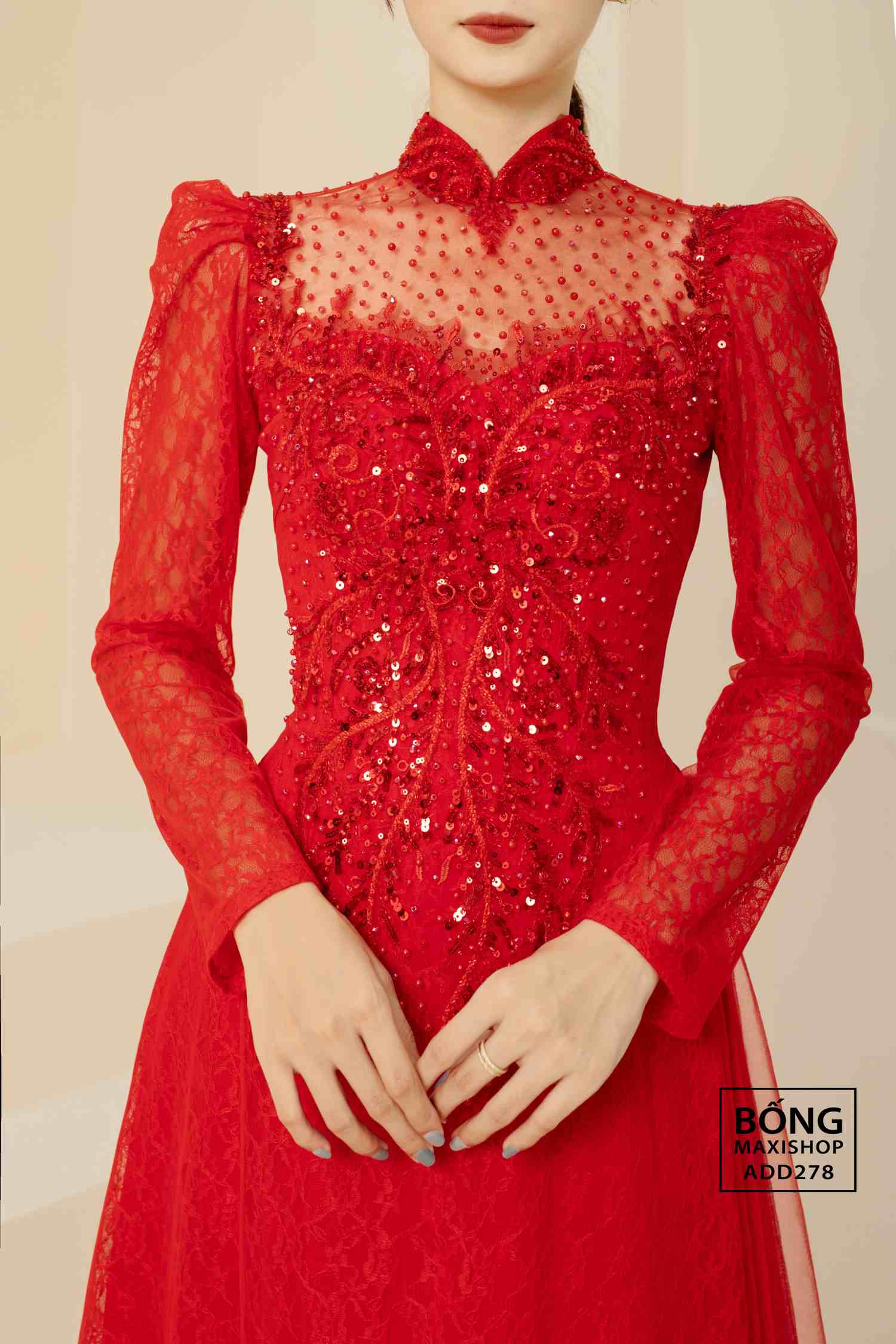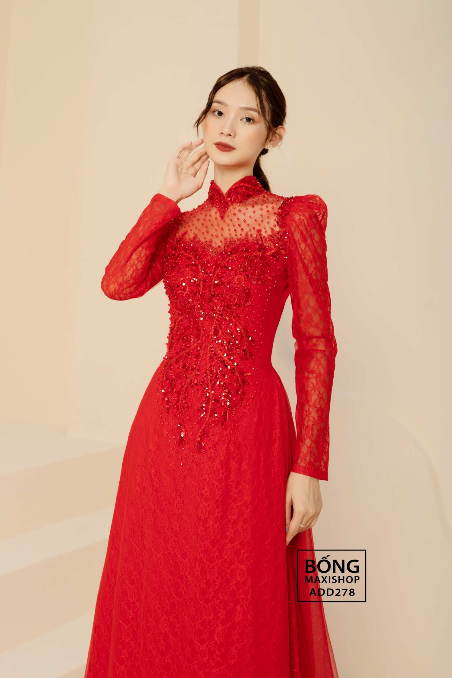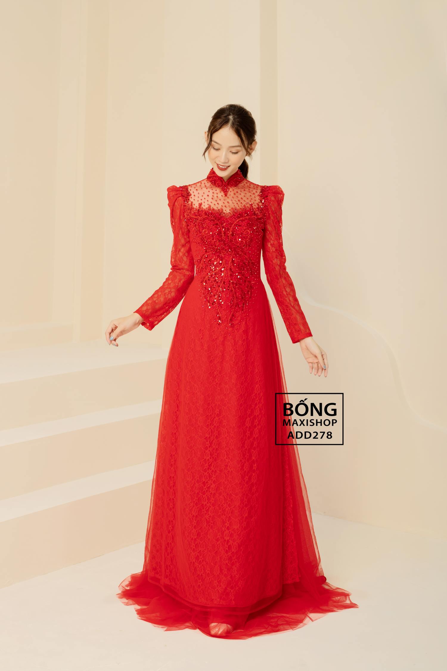Áo dài cô dâu ren cườm đỏ lấp lánh ADD278 được các quý cô yêu thích bởi vẻ đẹp nữ tính và kiều diễm. Chiếc áo dài đỏ được may từ chất liệu vải ren với những hoa văn nữ tính, mềm mại. Tay áo được thiết kế tay phồng kết hợp với cổ áo dài đứng mang nét cổ điển, thanh tao. Điểm nhấn của chiếc áo dài cưới này nằm ở họa tiết hoa được may nổi trước ngực và đính đá lấp lánh. Thay vì sử dụng quần thì phần thân dưới của chiếc áo dài được thay thế bởi chân váy xòe bồng, thướt tha. Chiếc áo dài cưới đỏ không chỉ tạo nên vẻ đẹp thanh tao, sắc sảo mà còn tượng trưng cho lời chúc may mắn, hạnh phúc cho cô dâu. Hãy liên hệ ngay với Bống Maxishop để được tư vấn chi tiết nhé.