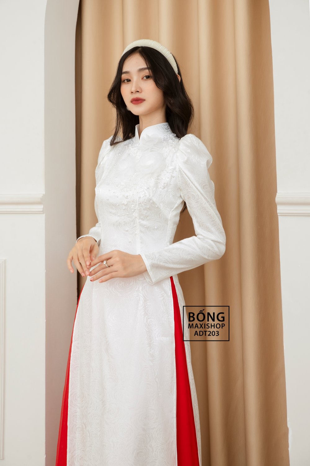 Áo dài trắng cưới gấm tay phồng 4 tà nền hồng lớn ADT203 sở hữu những đường may tỉ mỉ của áo cùng thiết kế tay phồng mang lại nét nữ tính, yêu kiều cho các quý cô. Điểm nhấn nổi bật nằm ở ngực áo sở hữu ba bông hoa lớn, xung quanh là những bông hoa được thêu nổi. Ngoài ra, các viên ngọc được đính quanh cổ áo và tỏa dần xuống phía ngực áo làm tăng thêm sự rực rỡ.