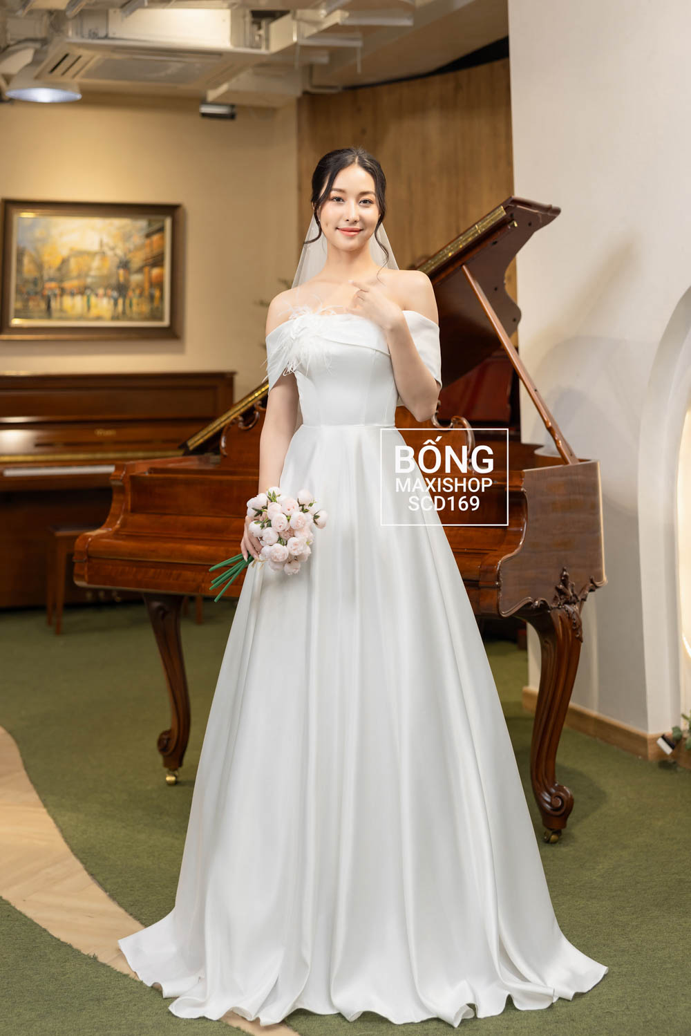 Mua ngay: Váy cưới phi nhật trễ vai ngang trắng hoa lông vũ 1 bên SCD169T