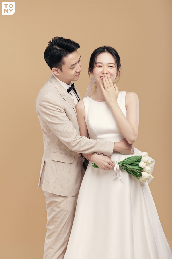 Đây là kiểu dáng phổ biến nhất. Hai bạn có thể đứng sát vào nhau, chú rể ôm eo cô dâu, cả hai cùng nắm tay... nhưng đừng để tay trông lỏng lẻo hoặc cứng nhắc. Một mẹo nhỏ là các bạn dáng gầy nên chụp chính diện, còn các bạn dáng đầy đặn hơn nên đứng nghiêng góc 45 độ để vóc dáng trông thon gọn hơn.