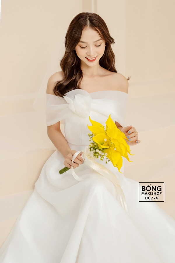 Mua ngay: Váy cưới xốp trễ vai trắng họa tiết hoa DC776T