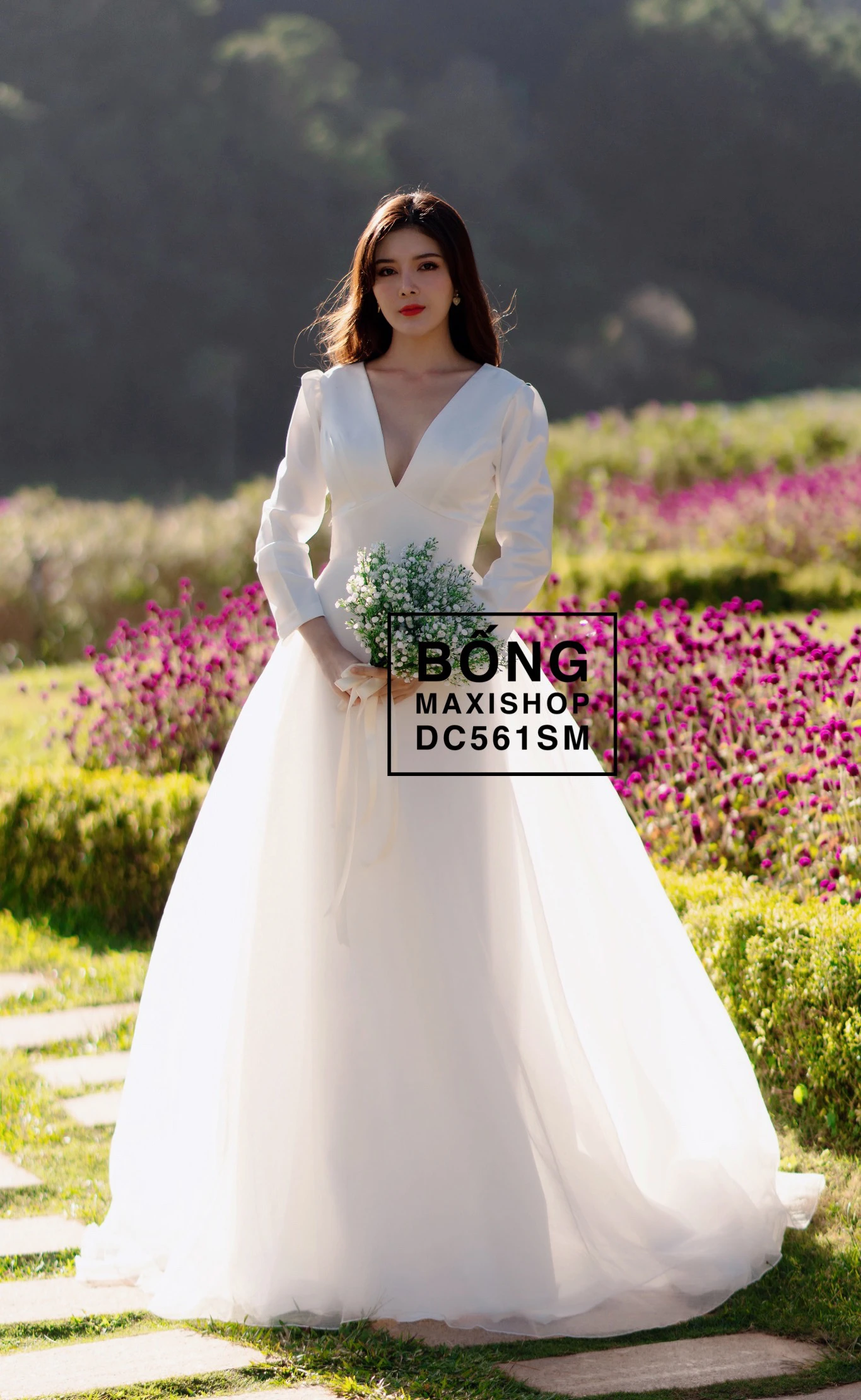 - Váy cưới DC561: Một mẫu váy mặc sau đám cưới đầy lộng lẫy với sự kết hợp giữa thân trên tay dài bằng phi nhật sang trọng và tùng váy voan xốp bồng bềnh, bay bổng.