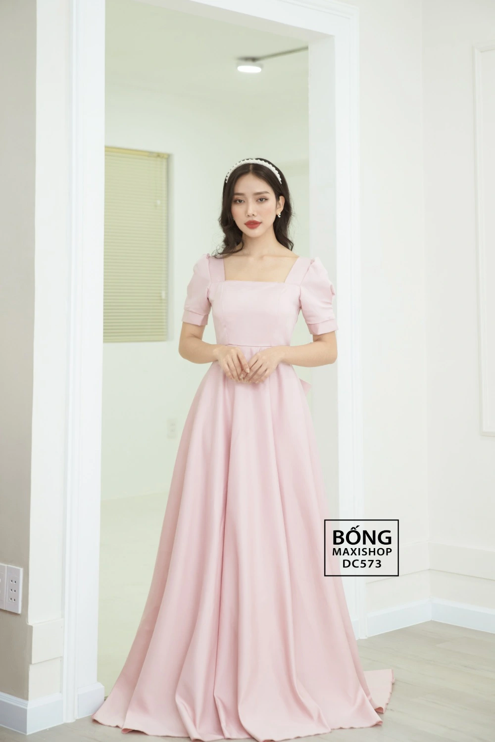 - Váy cưới DC573: Dành cho cô dâu "bánh bèo" với sắc hồng pastel ngọt ngào, đôi tay phồng cổ điển và điểm nhấn bất ngờ là chiếc nơ xinh xắn ở sau lưng.