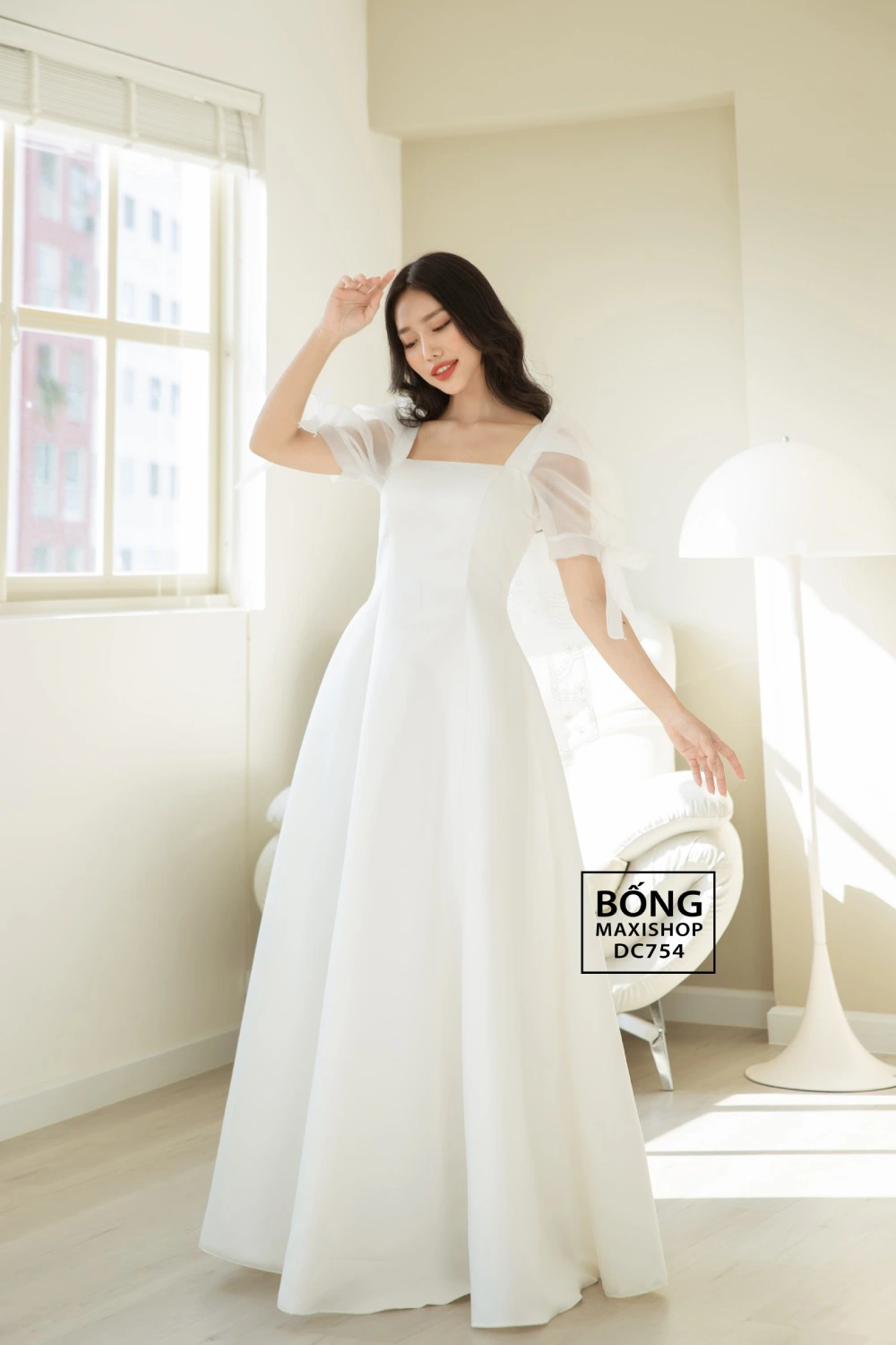 - Váy cưới DC754: Đậm chất "nàng thơ" với đôi tay bồng làm từ chất liệu organza trong suốt, nhẹ nhàng, mang lại vẻ ngoài rất dịu dàng, bay bổng.