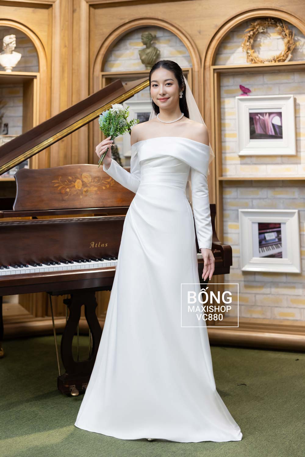 - Váy cưới VC880: Dành cho cô dâu có phong cách tối giản, sang trọng. Phom váy suông thanh lịch cùng phần trễ vai bản to và đôi tay dài hiện đại, mang lại một vẻ ngoài vô cùng "tây". Đảm bảo mọi đôi mắt trong bữa tiệc sẽ chỉ dành cho bạn mà thôi.