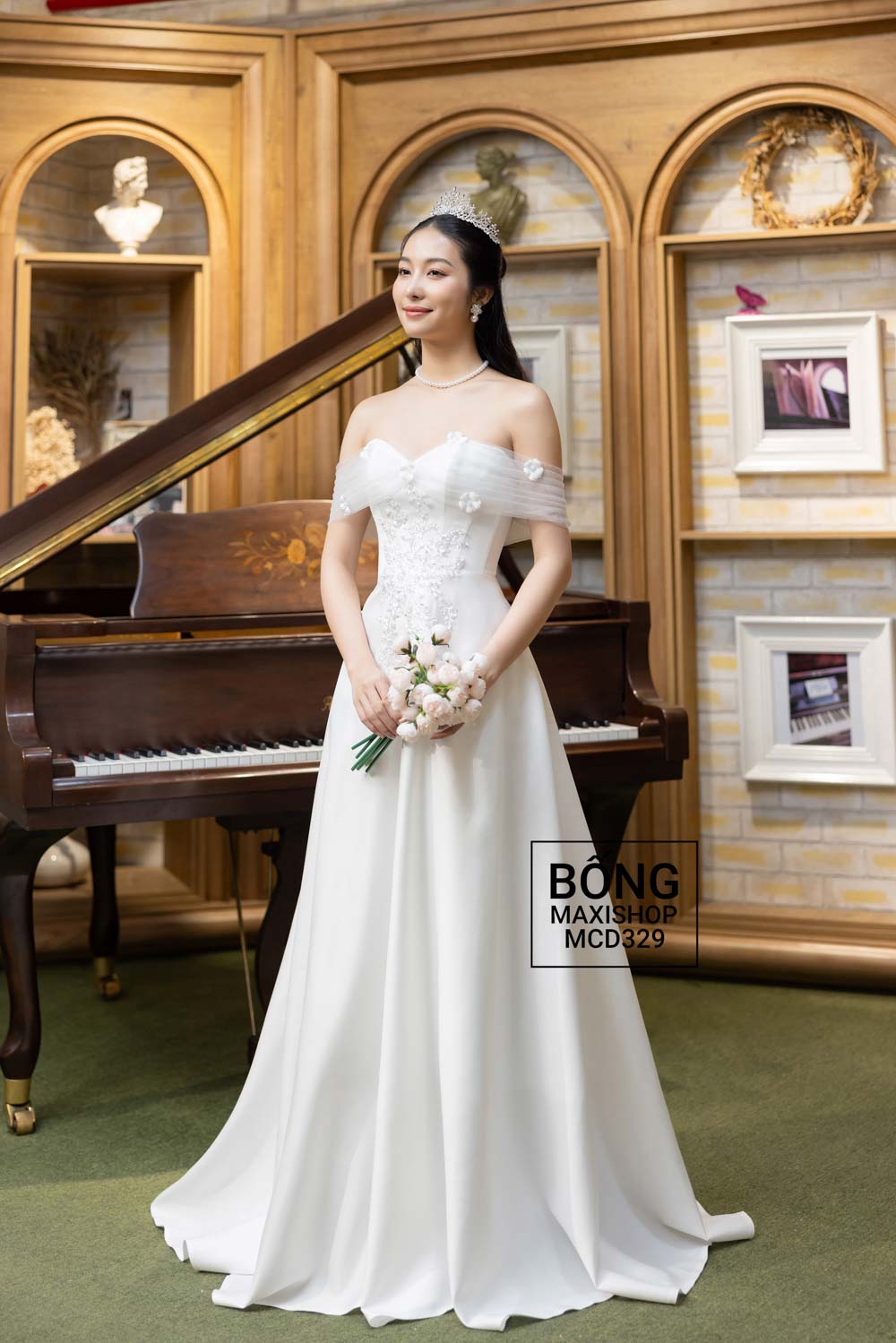 Mua ngay: Váy cưới phi nhật trễ vai trắng lưới điểm hoa eo kim sa tỏa MCD329