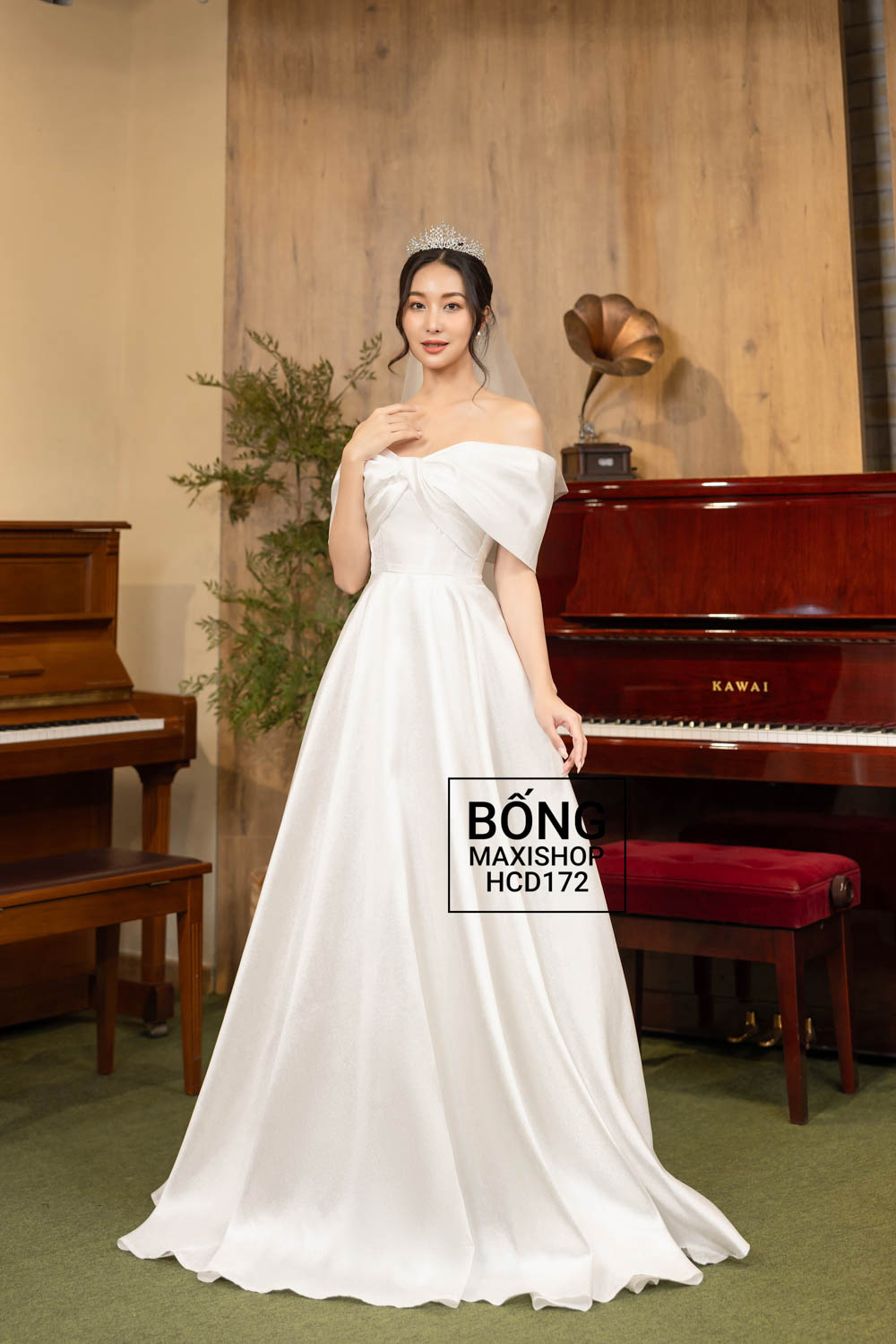 - Váy cưới HCD172T: Mẫu váy đi bàn cô dâu đơn giản này toát lên vẻ sang trọng, cổ điển với phần ngực được tạo hình nơ vặn tinh tế trên nền vải tafta nhũ bắt sáng lấp lánh.