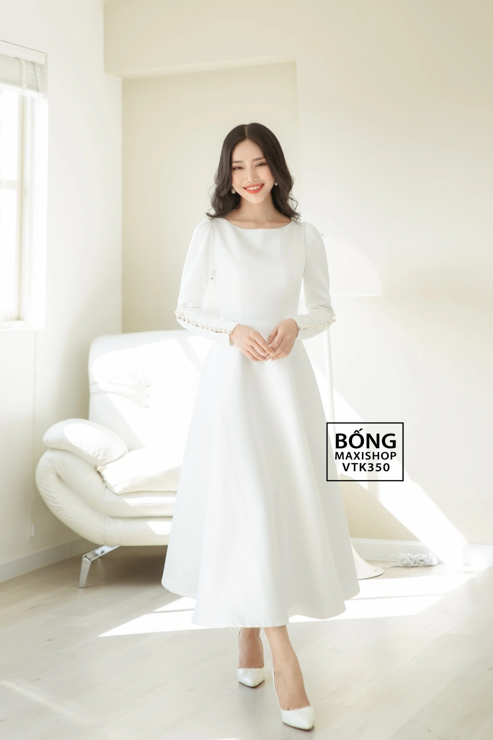 - Váy thiết kế VTK350: Mang đậm hơi thở của thời trang thập niên cũ, VTK350 là hiện thân của vẻ đẹp thanh lịch vượt thời gian. Sự đắt giá của thiết kế không nằm ở chi tiết cầu kỳ, mà ở hàng ngọc trai được đính kết tỉ mỉ dọc theo cổ tay áo dài, một điểm nhấn kín đáo nhưng đủ để khẳng định đẳng cấp.