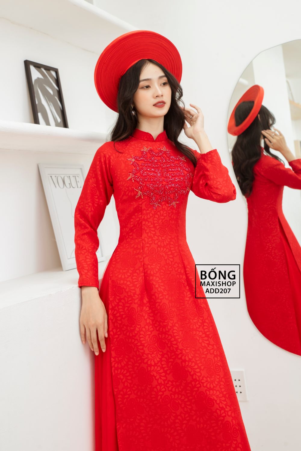 Mua ngay: Áo dài cô dâu gấm me đỏ kết cườm ADD207
