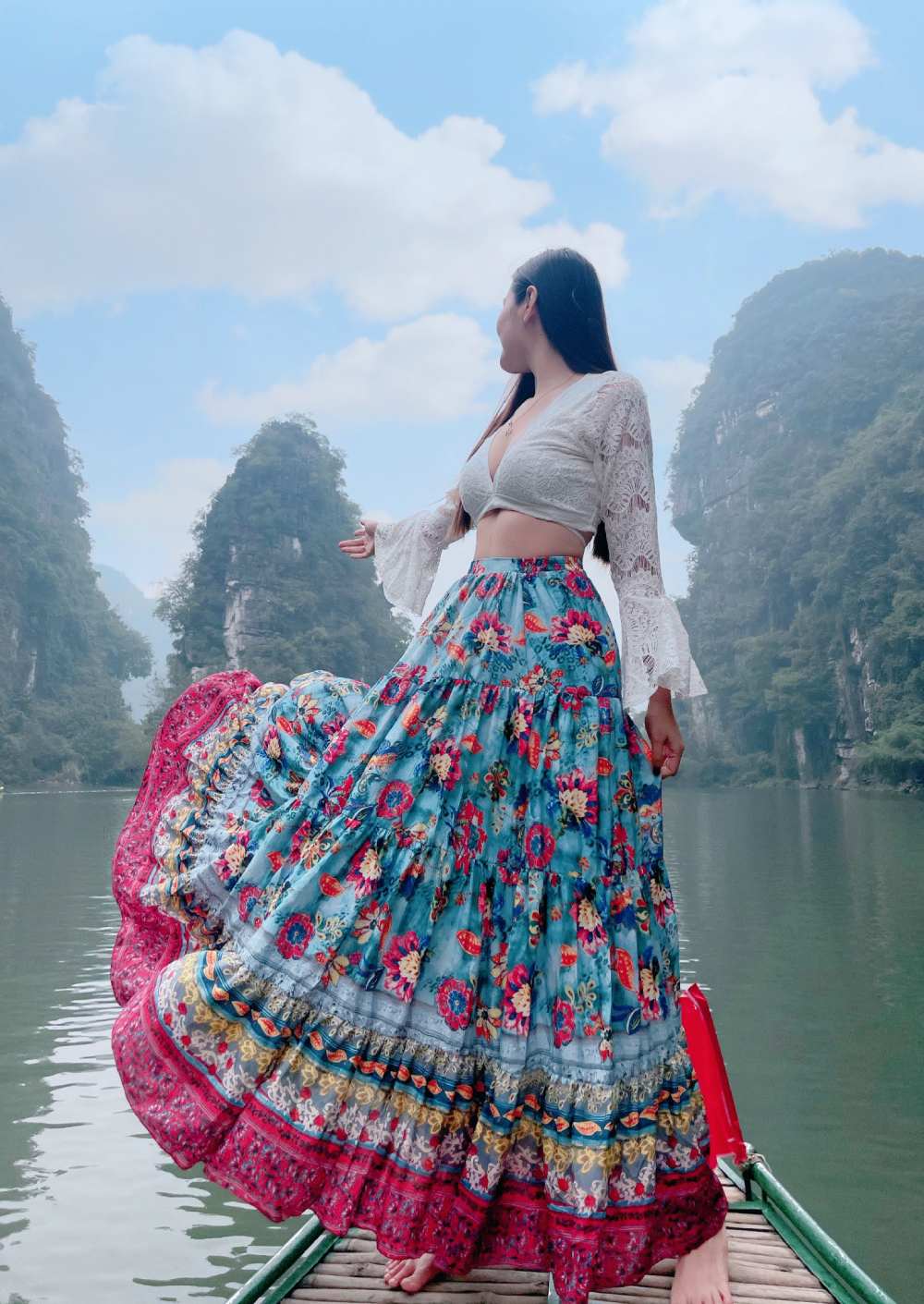 Đầm Maxi Set Chân Váy Hoa Xanh Áo Ren Tay Loe Trắng DM741 rất được phái đẹp yêu thích bởi vẻ đẹp tươi trẻ và phóng khoáng. Chiếc đầm maxi có 2 mảnh riêng biệt gồm phần áo được làm từ chất liệu ren ôm lấy cơ thể, cổ chữ V xẻ sâu kết hợp với tay áo loe điệu đà. Phần chân váy chính là điểm nhấn của chiếc đầm với thiết kế dài, rộng tạo hiệu ứng bồng bềnh, thướt tha trong làn gió. Chiếc váy sở hữu nền xanh dương tươi mát được điểm thêm các họa tiết thổ cẩm khắp chân váy tạo nên một vẻ ngoài độc đáo, thu hút. Hãy liên hệ Bống Maxishop ngay để được tư vấn chi tiết nhé.