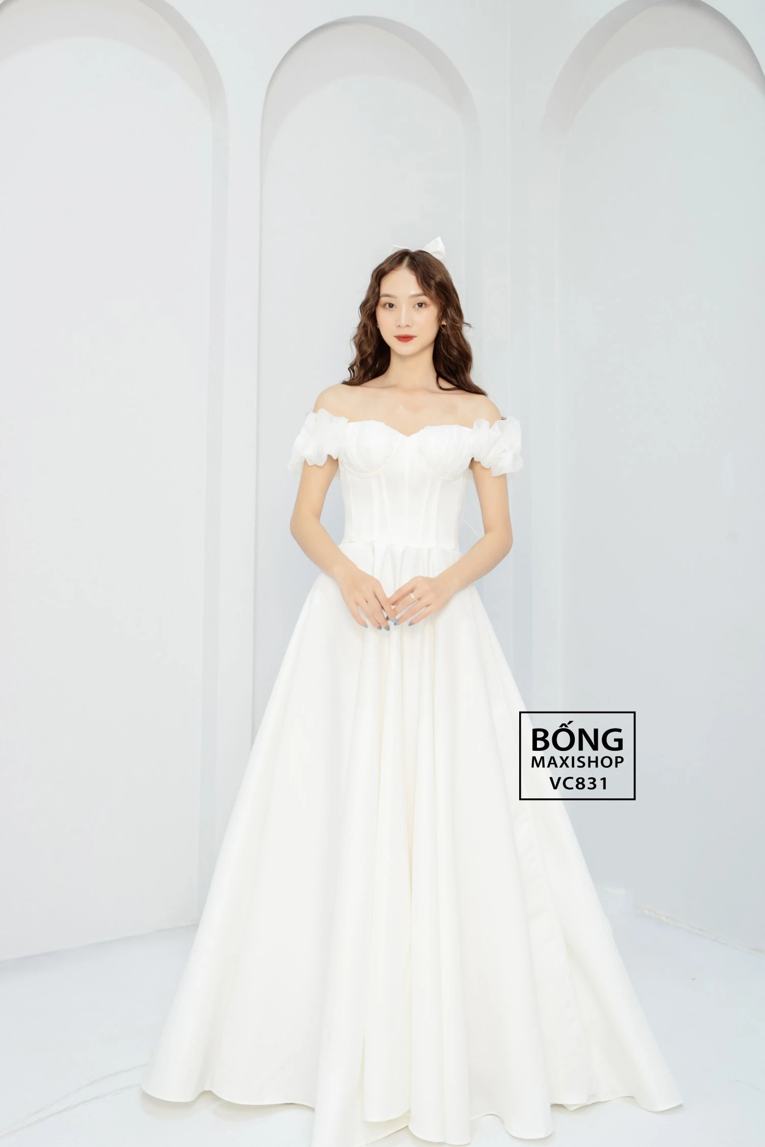 Mua ngay: Đầm cưới phi nhật trễ vai organza chân eo trắng VC859