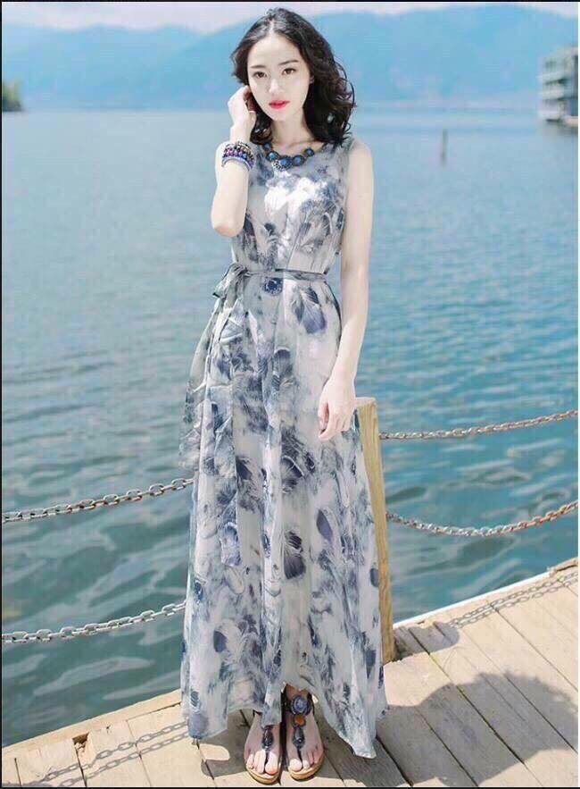 Khi đi du lịch bạn diện váy đầm maxi đi dạo đi chơi đồng thời bạn có thể mặc áo sơ mi sắc màu và hạo tiết cột ngang eo , phong cách này không hề kén vóc sáng , tôn được chiều cao mà năng động .