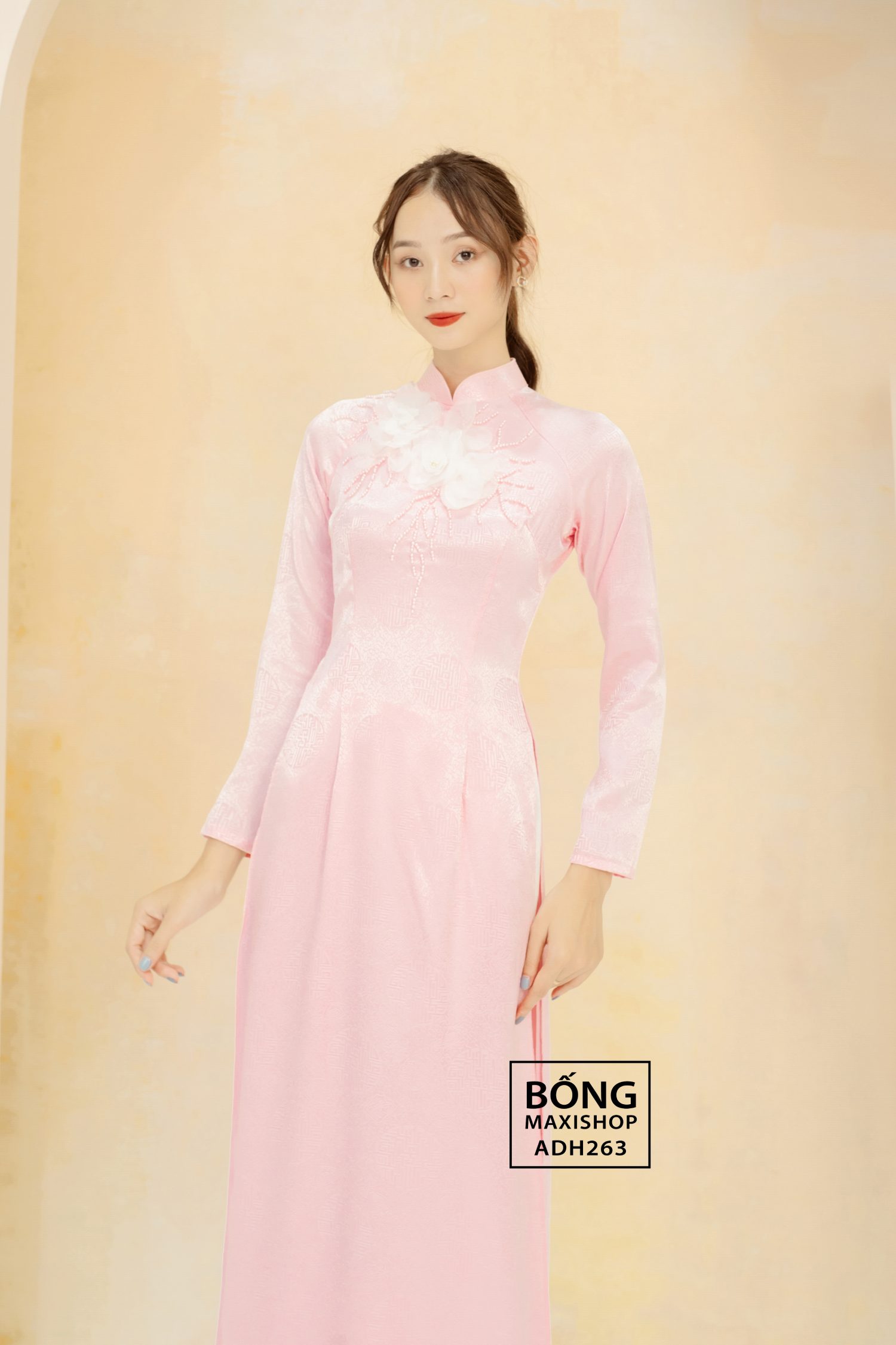 Mua ngay: Áo dài cô dâu nữ gấm 4 tà hồng kết hoa trắng ADH263