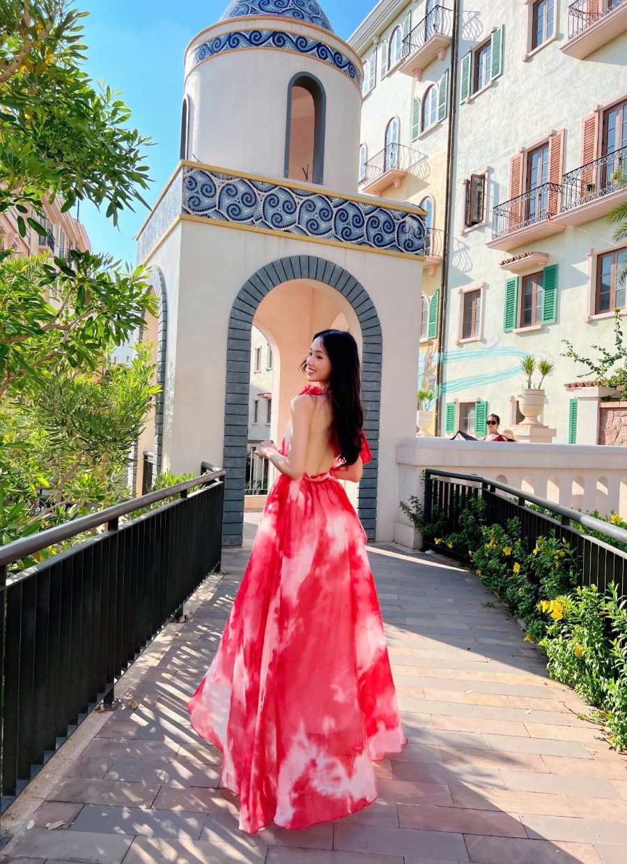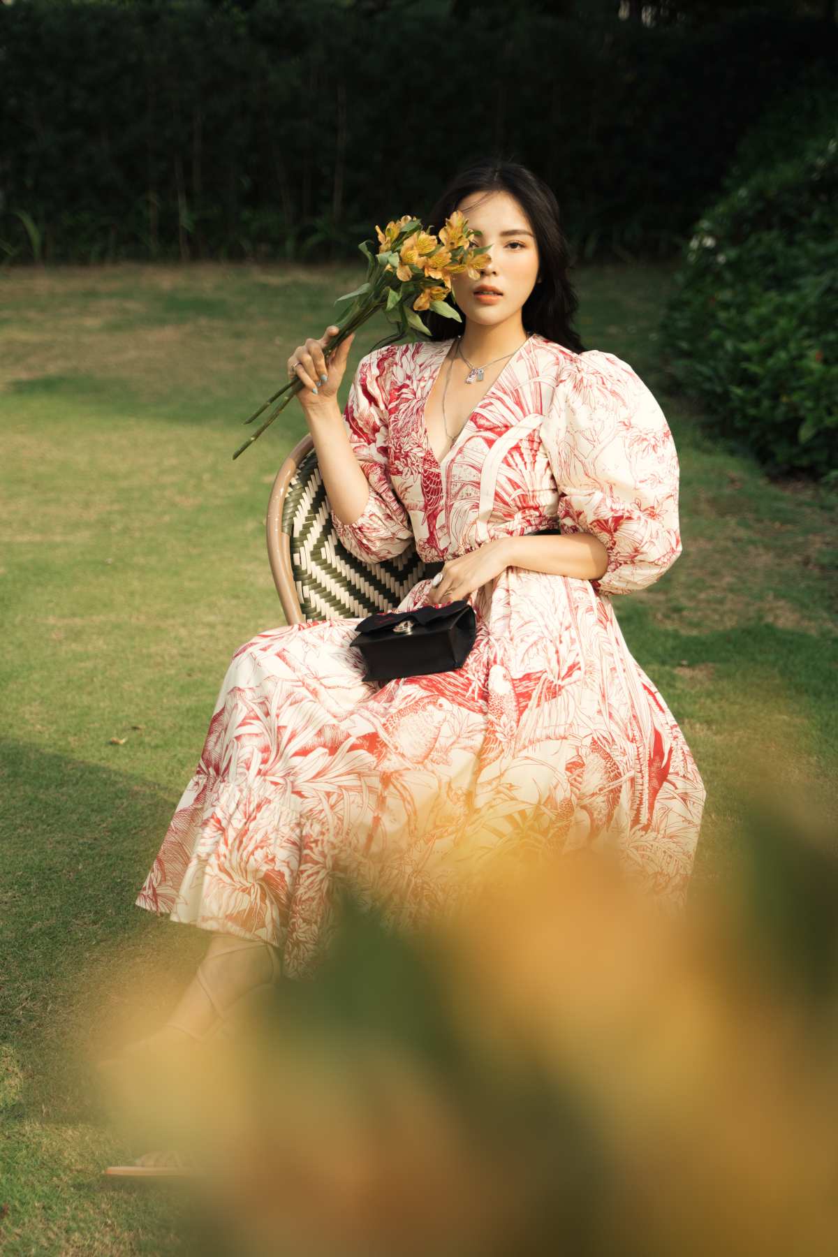 Hoa hậu Kỳ Duyên mặc một chiếc đầm maxi hoa cổ V màu đỏ trắng khiến cô trông tươi tắn, tràn đầy sức sống. Chiếc thắt lưng màu đen, đôi giày cao gót màu be và chiếc túi Christian Louboutin nâng tầm set đồ của cô thêm đẳng cấp và thanh lịch.
