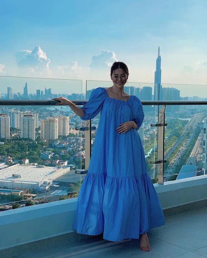Hoa Hậu Phương Khánh điệu đà và phóng khoáng trong thiết kế đầm maxi cổ vuông rộng rãi với tay áo phồng màu xanh dương Pastel.