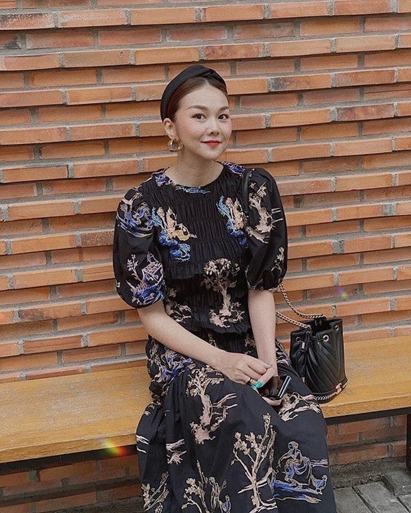 Thanh Hằng diện đầm maxi dài đen tay phồng họa tiết hoa