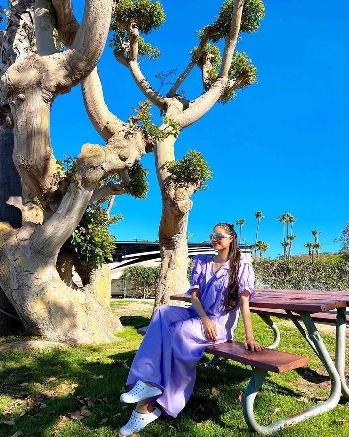 Hoa hậu Phạm Hương diện chiếc đầm maxi dài màu tím Pastel dáng rộng với kính râm hiện đại và dép Crocs khiến cô trông trẻ trung năng động.