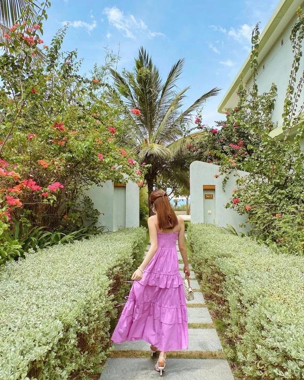 Chloe Nguyễn mặc đầm maxi dài suông phân tầng màu tím
