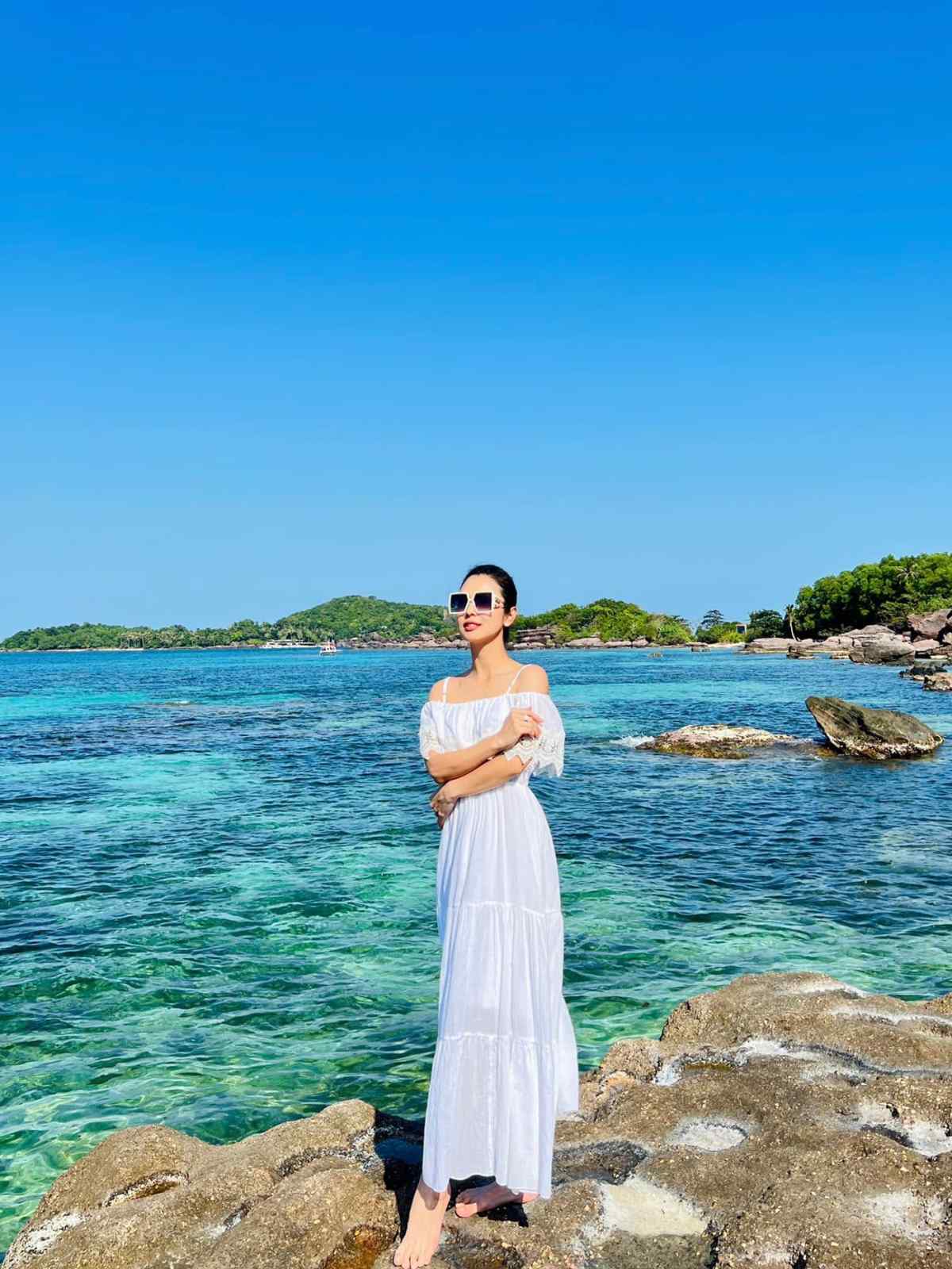 Jennifer Phạm diện đầm maxi dài trễ vai màu trắng