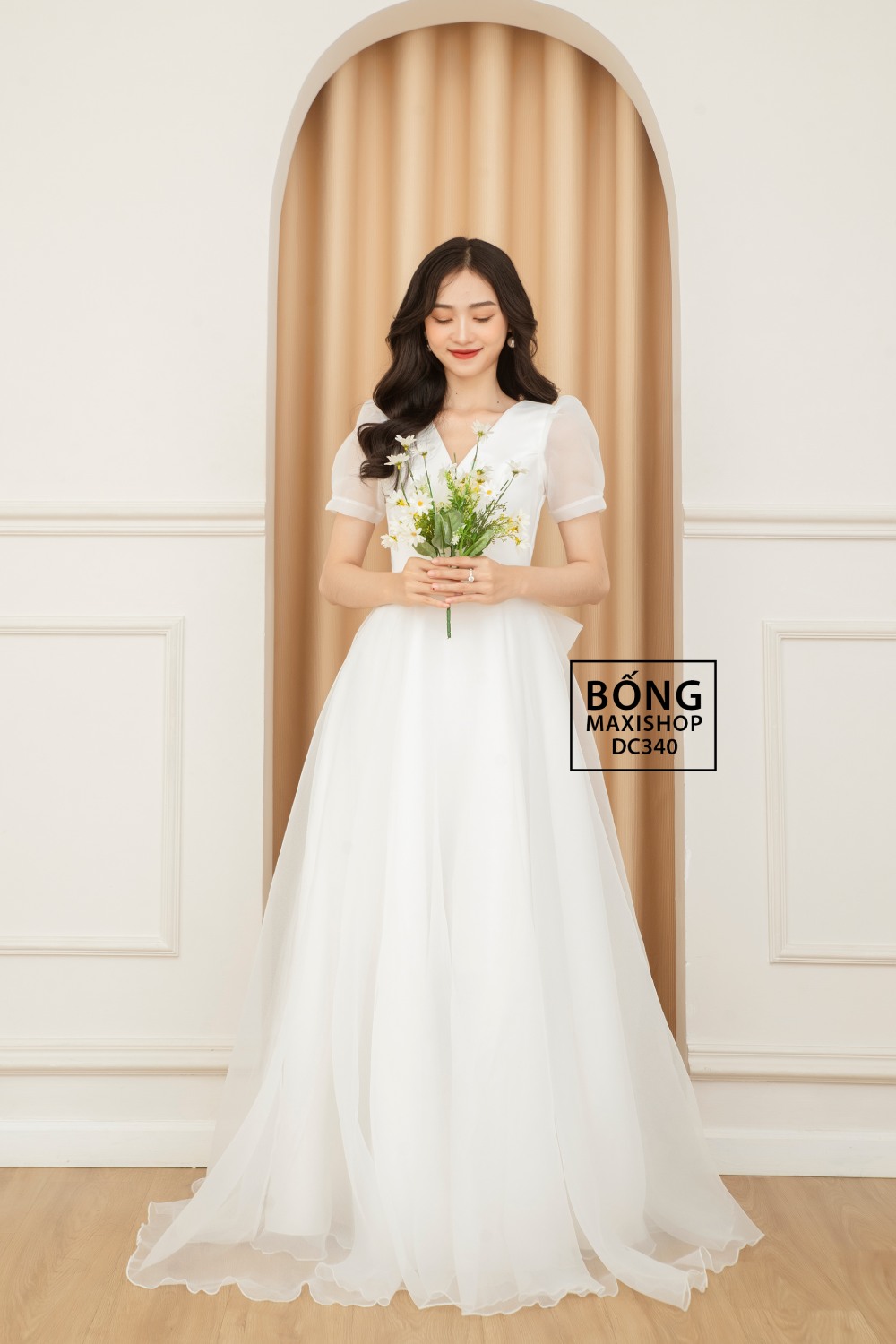 Váy cưới màu trắng voan xốp cổ V kèm nơ DC340T