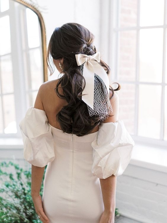 Một kiểu tóc đơn giản, thích hợp với váy cưới trễ vai, mang lại sự nữ tính, nhẹ nhàng cho cô dâu. Cô dâu chỉ cần được uốn tóc nhẹ nhàng, sau đó cột buông lỏng nửa trên để tạo cảm giác giản dị nhưng thanh lịch. Bật mí cho bạn rằng những chiếc váy cưới trễ vai đơn giản có chất liệu ren sẽ rất phù hợp với kiểu tóc này đấy.
