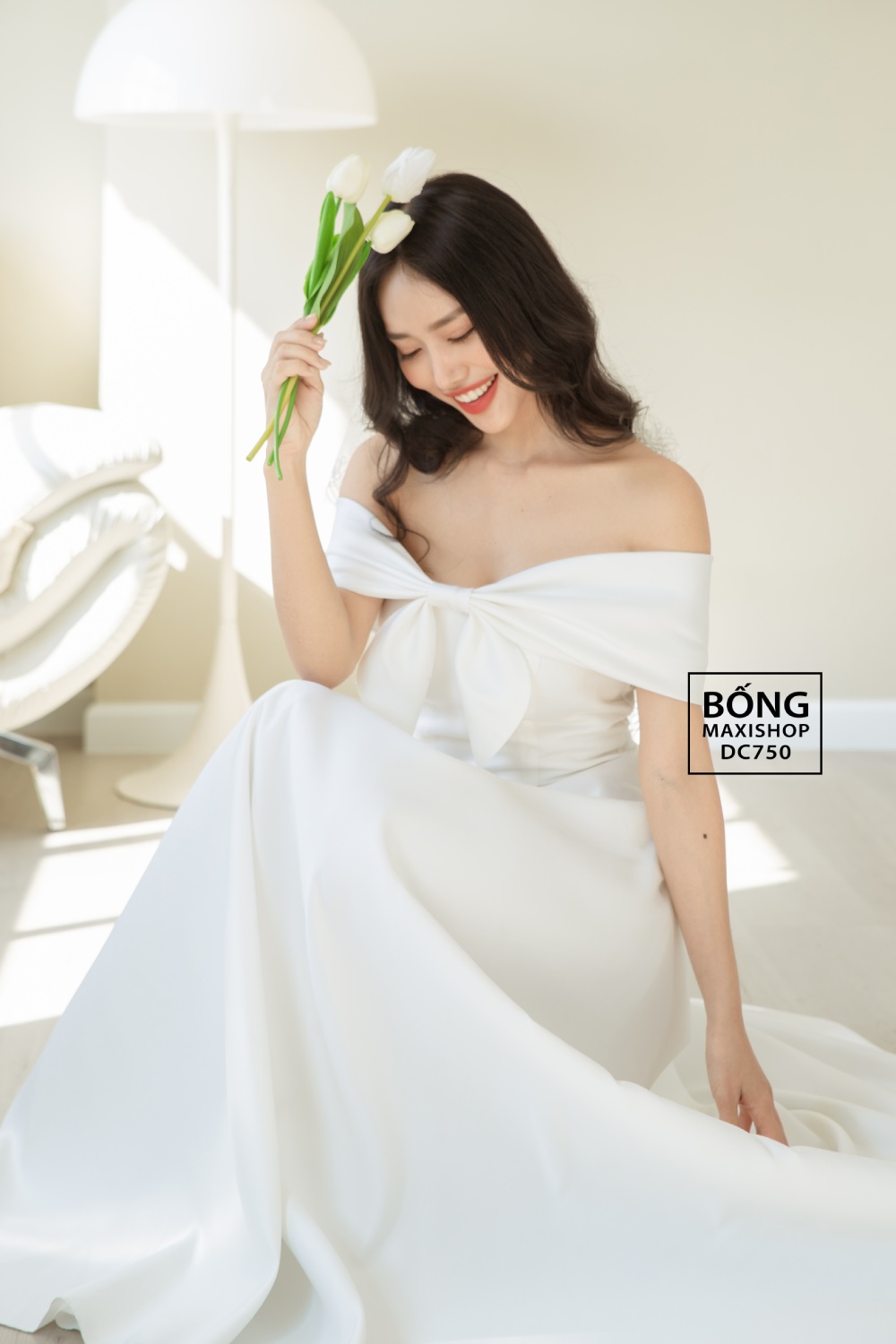 Mua ngay: Váy cưới phi nhật trắng trễ vai nơ chính diện DC750