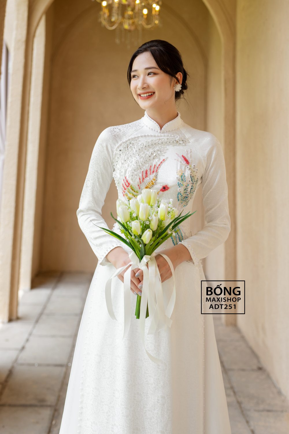 Mua ngay: Áo dài cô dâu gấm trắng kết chim phượng cổ 2 viền ngọc ADT251