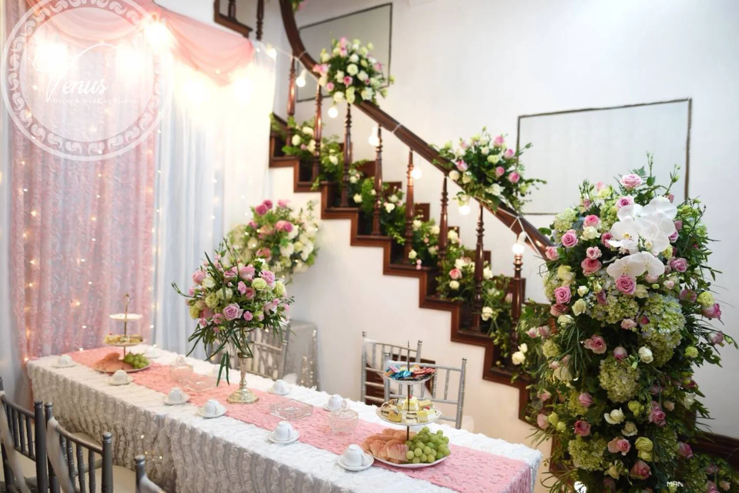 Để việc trang trí lễ ăn hỏi tại nhà gái thêm phần hoàn hảo, bạn đừng bỏ qua những chi tiết nhỏ trong nhà. Cầu thang, nơi cô dâu sẽ bước xuống để ra mắt hai họ, là vị trí thu hút rất nhiều ánh nhìn. Bạn có thể làm đẹp cho khu vực này bằng những dải lụa, voan mềm mại hay các cụm hoa tươi, hoa lụa bắt mắt dọc theo lan can.