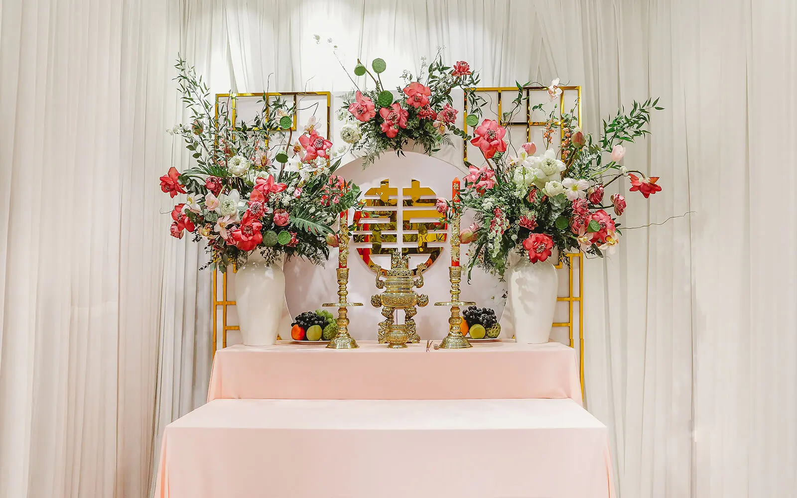 Bạn cần chuẩn bị: phông rèm phía sau (thường là màu đỏ hoặc hồng), chữ Hỷ, lư đồng và bát nhang được lau sáng bóng, một mâm ngũ quả đầy đặn, hoa tươi (cúc, lay ơn, sen) và không thể thiếu cặp nến tơ hồng long phụng để tăng thêm phần trang trọng.