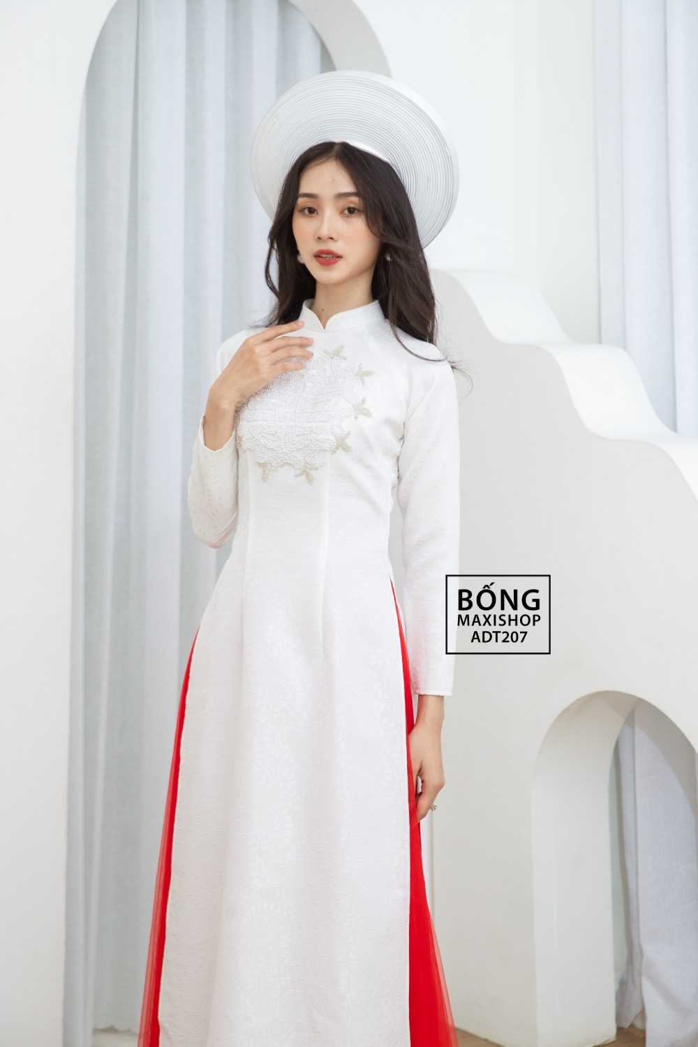 Mua ngay: Áo dài cô dâu gấm me trắng kết cườm ADT207