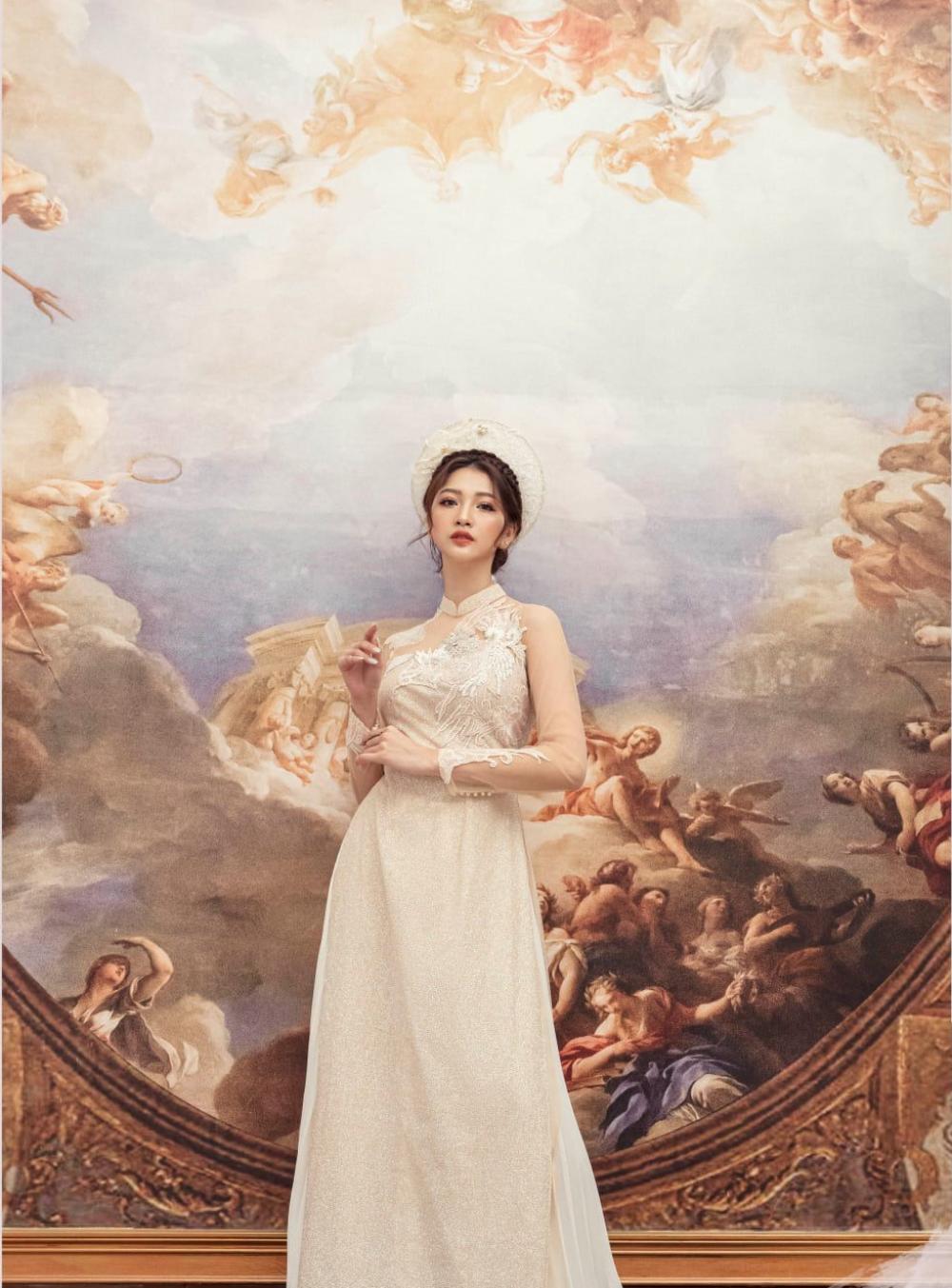 Tóc thẳng thả tự nhiên đội mấn mặc áo dài trắng cô dâu đơn giản