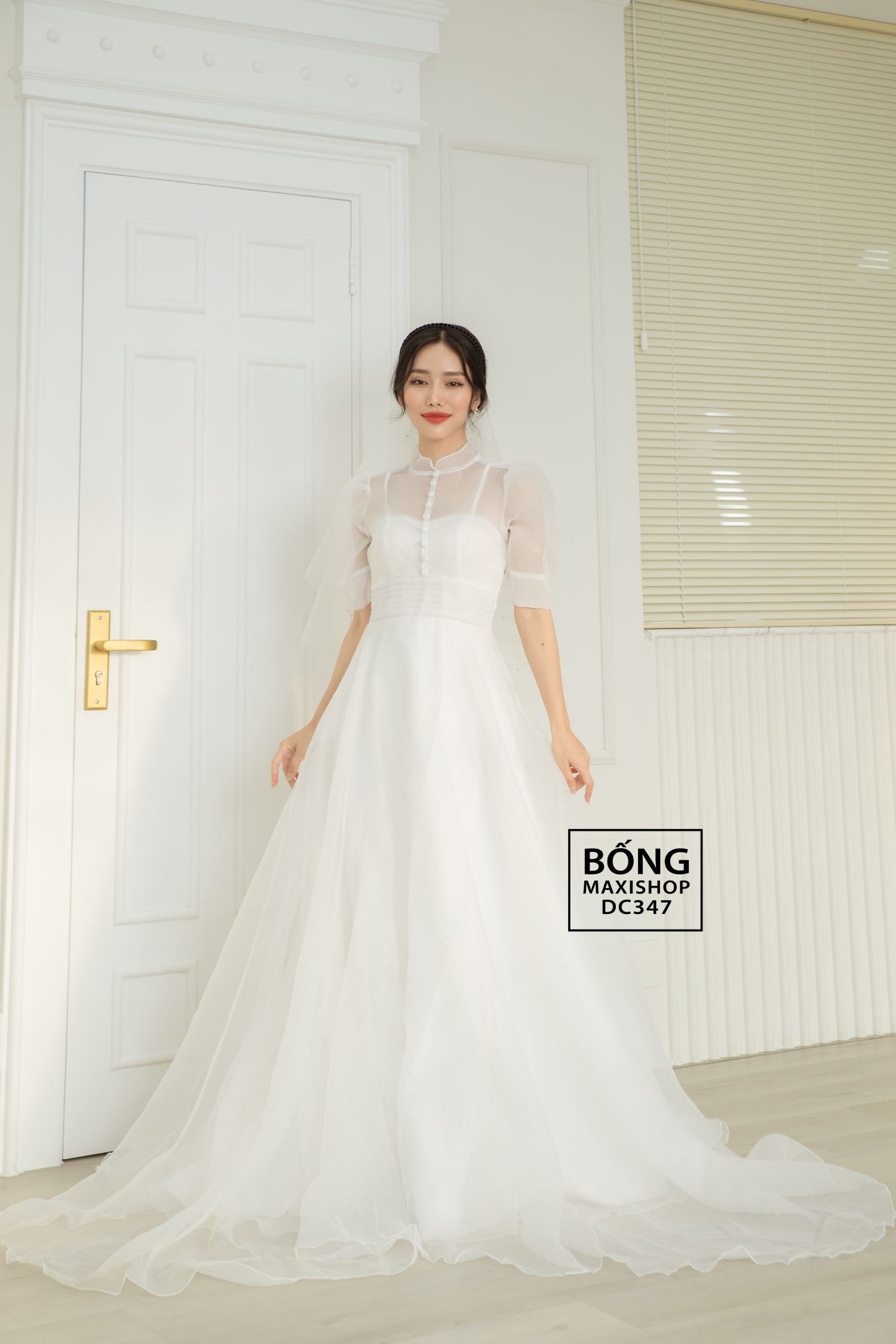 Nếu nàng ưa chuộng phong cách cổ điển, đang tìm kiếm chiếc váy cưới tay phồng điệu đà và sang trọng nhưng không biết mua áo cưới ở đâu Hà Nội, thì đừng bỏ lỡ mẫu váy cưới xốp trắng tay phồng cổ trụ DC347 tại Bống Maxishop. Chất liệu xốp cao cấp được cắt may tỉ mỉ tạo nên thiết kế bồng bềnh, thướt tha không thể rời mắt. Nửa thân trên được đính kết hàng nút cùng với phần cổ trụ mỏng nhẹ làm toát lên sự nền nã cho cô dâu. Đồng thời, phần eo được xếp ly tinh tế vừa tạo cảm giác nhỏ nhắn cho vòng eo, vừa tô điểm thêm nét kiều diễm cho nàng.