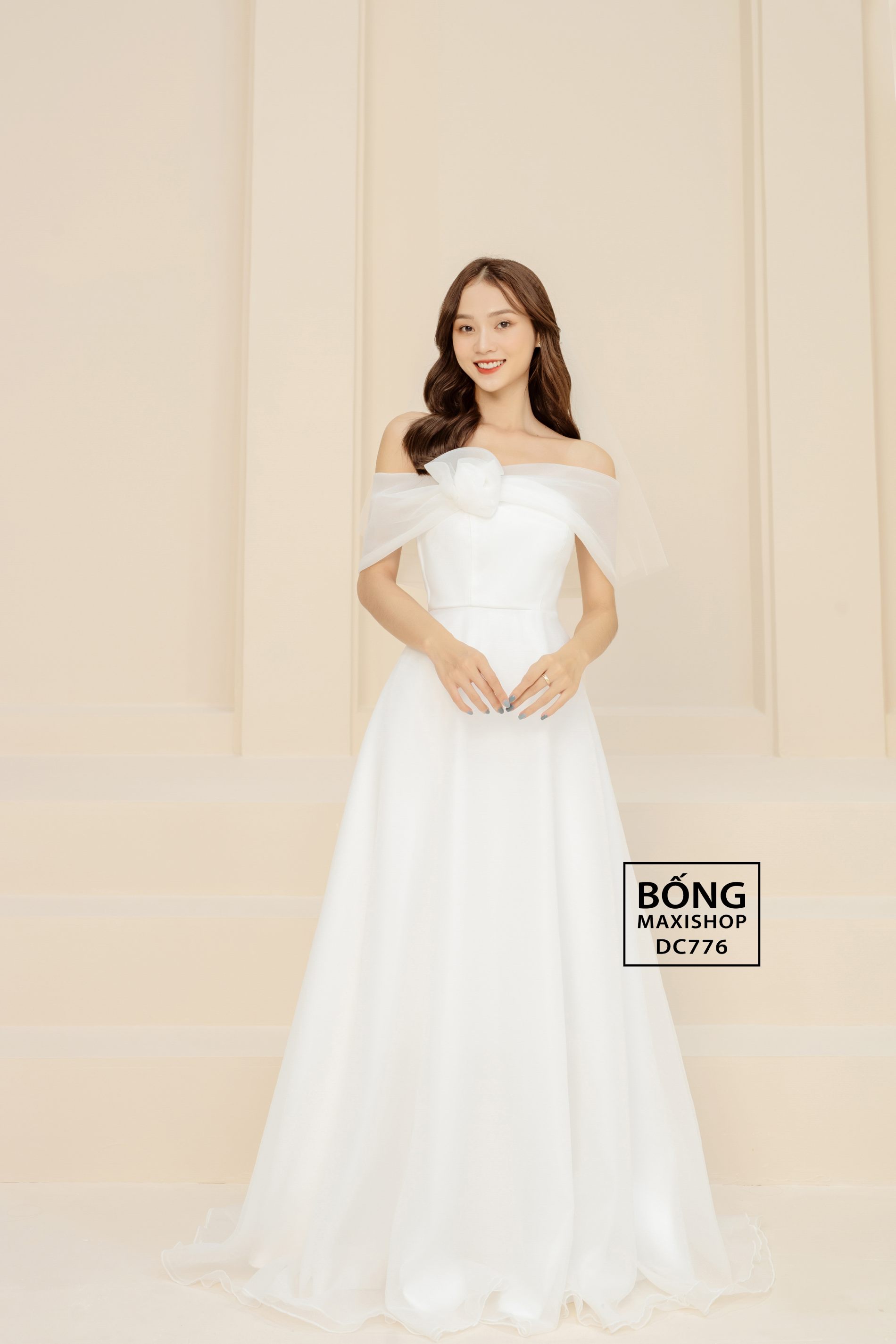 Váy cưới phi nhật trắng trễ vai phối voan xốp kèm nơ DC782 dành cho cô dâu kiều diễm