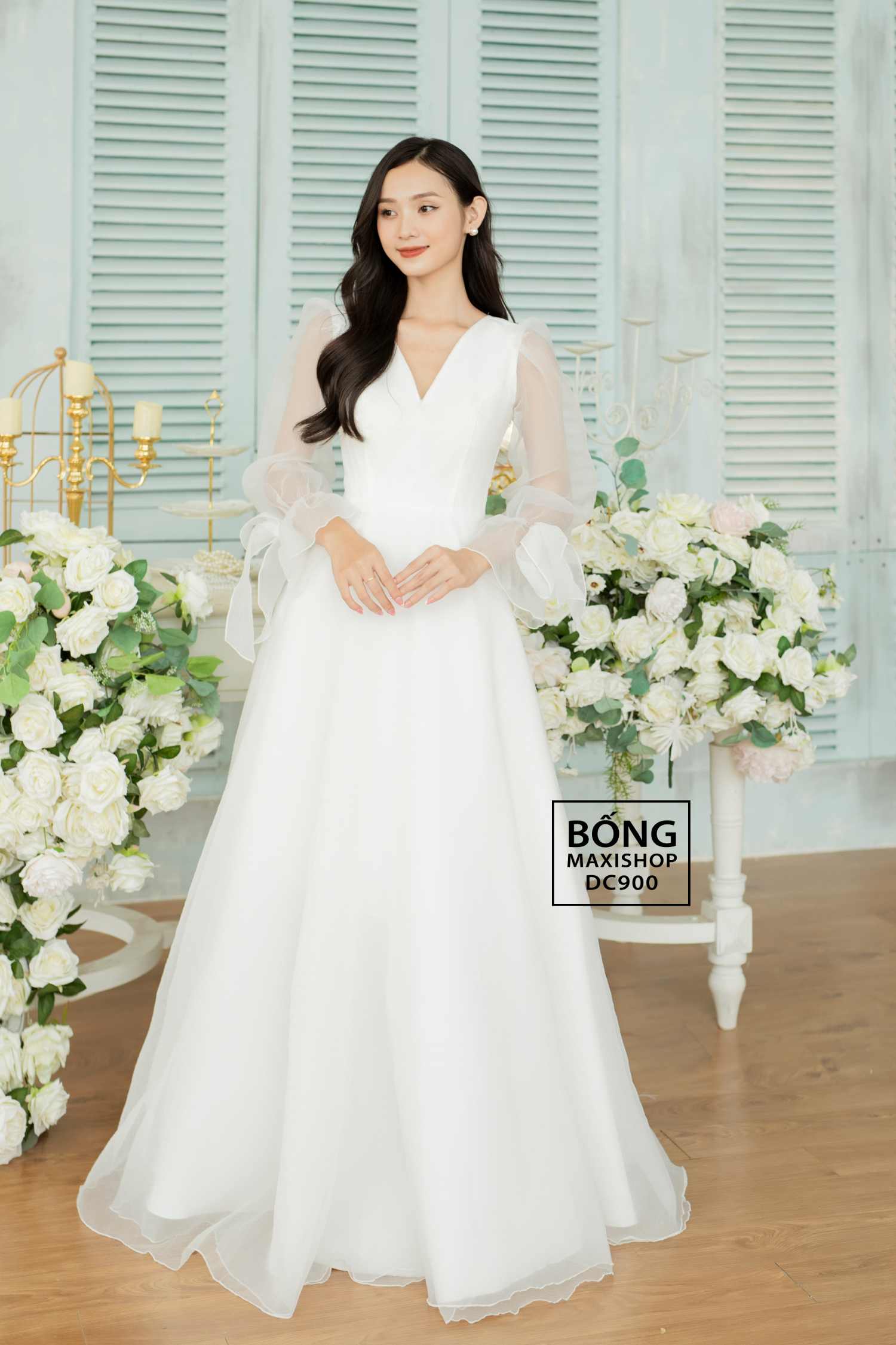 Mua áo cưới ở đâu Hà Nội vừa mang đậm tinh thần phóng khoáng nhưng vẫn giữ được nét kín đáo đầy cuốn hút đã không còn là lo ngại của các nàng, vì với mẫu váy cưới xốp trắng cổ V DC900 tại Bống Maxishop, nàng sẽ tỏa sáng nhờ thiết kế tinh tế cùng đường may tỉ mẩn. Váy cưới đơn giản với cổ áo xẻ ngực chữ V sâu vừa phải, kết hợp tay áo dài xuyên thấu buộc nơ ở cổ tay mang nét đẹp kín đáo nhưng vẫn trông quyến rũ, thu hút. Thêm vào đó, dáng váy dài cùng chất liệu xốp nhẹ, bồng bềnh với độ phồng vừa phải tôn lên nét dịu dàng, thướt tha cho cô dâu.