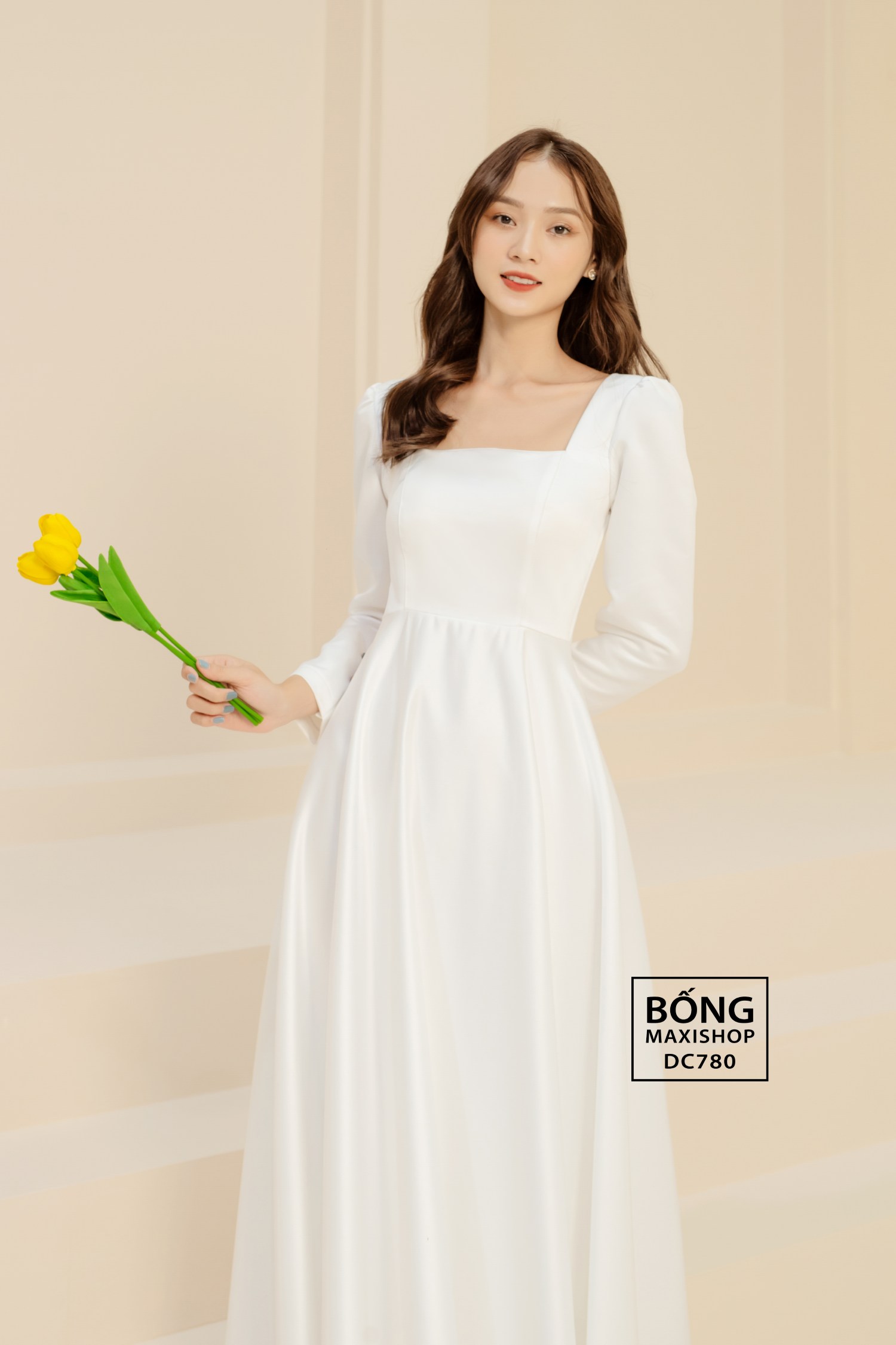 Váy cưới phi nhật cổ vuông tay dài trắng DC780 mang đến cho cô dâu vẻ đẹp thanh lịch, kín đáo nhưng không kém phần thu hút. Chất liệu phi nhật mềm mại và có độ bền cao, vừa tạo cảm giác đứng form váy, vừa giúp nàng thoải mái khi hoạt động trong suốt buổi tiệc. Tay áo dài với phần vai áo hơi bồng góp phần tôn lên đôi vai mảnh mai của cô dâu, đồng thời có thể giúp nàng che đi khuyết điểm nếu có. Cổ áo vuông làm cho chiếc váy trở nên thú vị hơn, khoe khéo xương quai xanh thanh mảnh và quyến rũ của nàng. Thêm vào đó, chân váy chữ A xếp ly dài qua chân mang đến sự đơn giản nhưng không kém phần lãng mạn, thướt tha cho thiết kế.