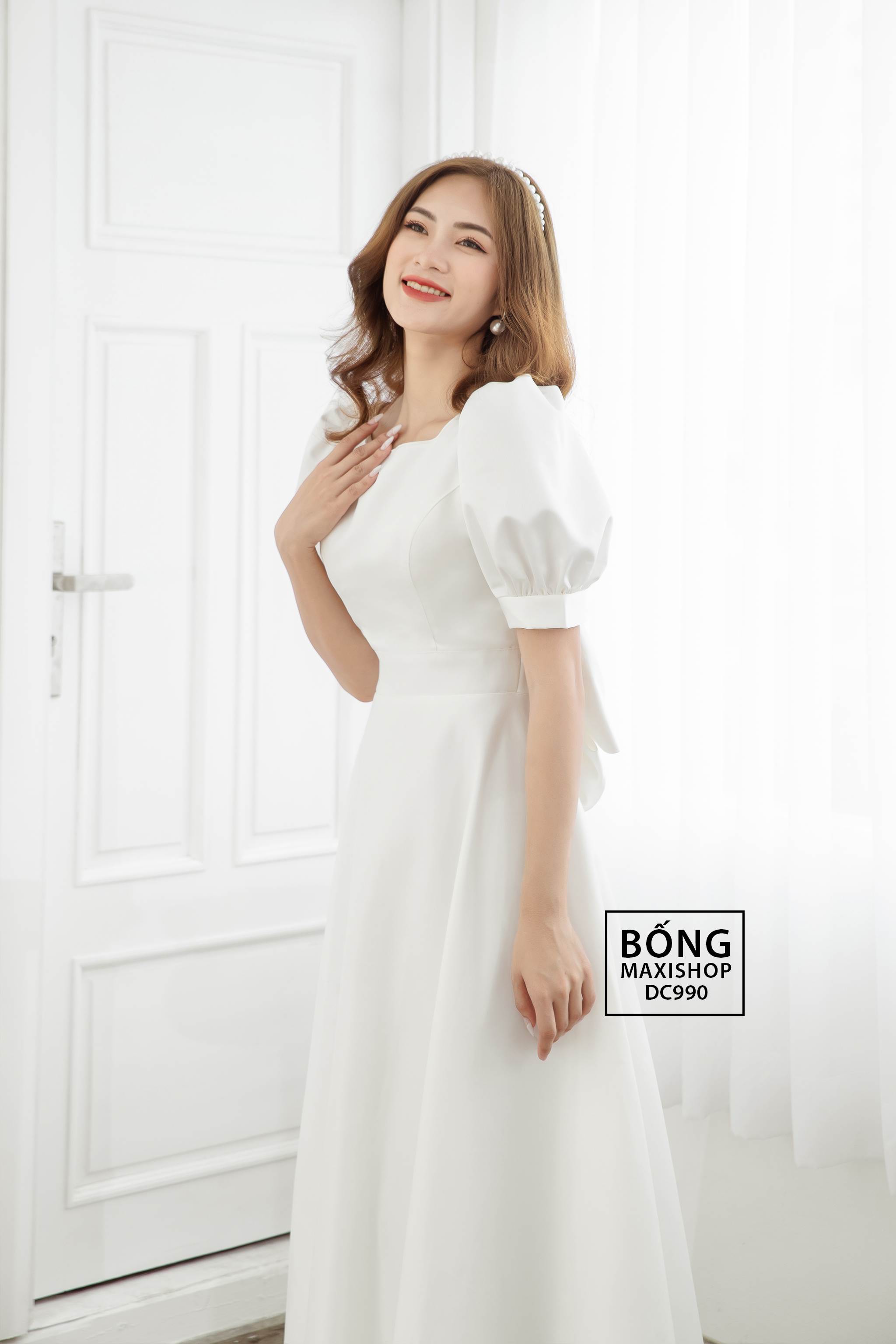 Mua ngay: Váy cưới phi nhật cổ vuông tay dài trắng DC780